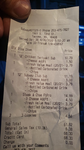 It's fine if you do not believe me, below is proof for you. For 3 sandwiches cost me a total of $68.30! Please, anyone who happens to see this review and think I am calling subway out simply because I am cheap, let me know because I sure feel like this "inflation" is a simple case of companies attempting to rip people off by price gouging in every single little way they can by simply raising prices. And yes, that means even charging a person an extra $10 for JUST A LITTLE EXTRA CHEESE!!!