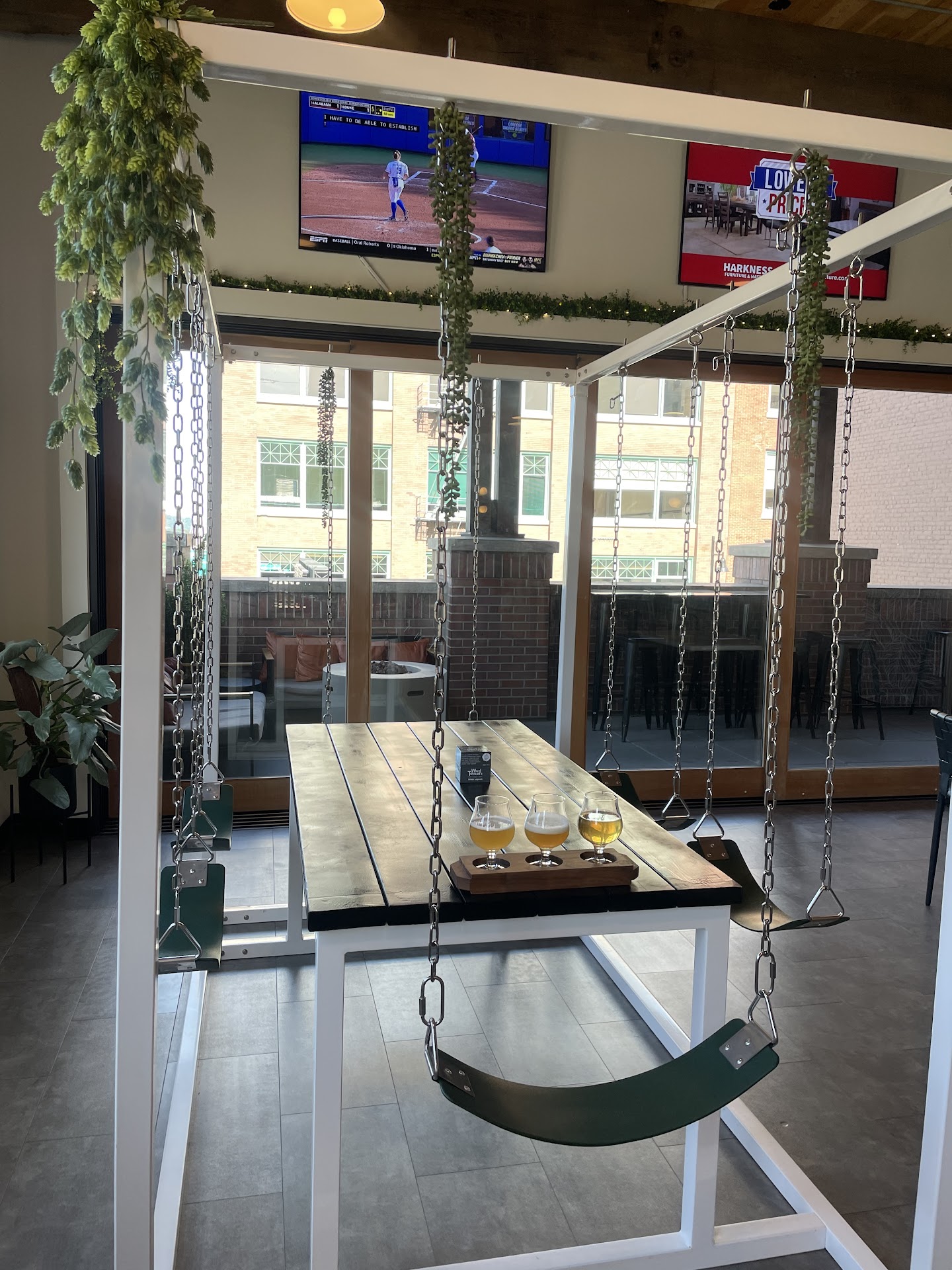 I did not see any food menus but looks like they have small snacks for purchase. They have 34 diverse taps of drinks/ beer that pour by the ounce and it tracks through a little wrist band you wear. Absolutely lovely idea and very welcoming location. They did have little card games like Uno, fact or fiction, etc. hanging around on the table. They had some very nice outdoor seating which was perfect for the lovely weather yesterday but i did opt for the swings!