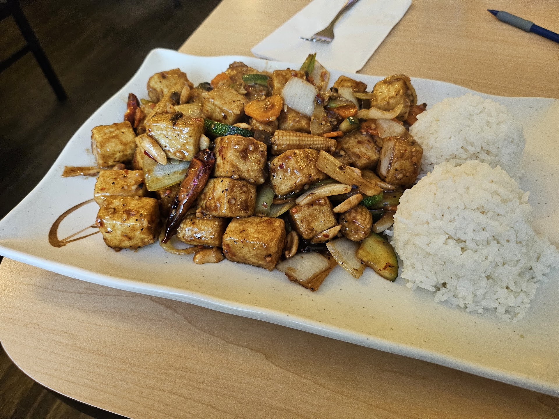 Came in because I saw there were vegetarian options and wanted to support a business near the campus. It's finals, so I was pretty exhausted and just asked the cashier what was recommended between two of the "wok" tofu options. She let me know that I could do a combo so I ordered that. Shortly after one of the cooks came out and started yelling at her rudely, all I could make out was kung pao tofu (again...tired). So that went on for a while, as the cashier went in the kitchen to talk, I just keep hearing her being yelled at, while she was clearly trying to find a solution to whatever was the problem.