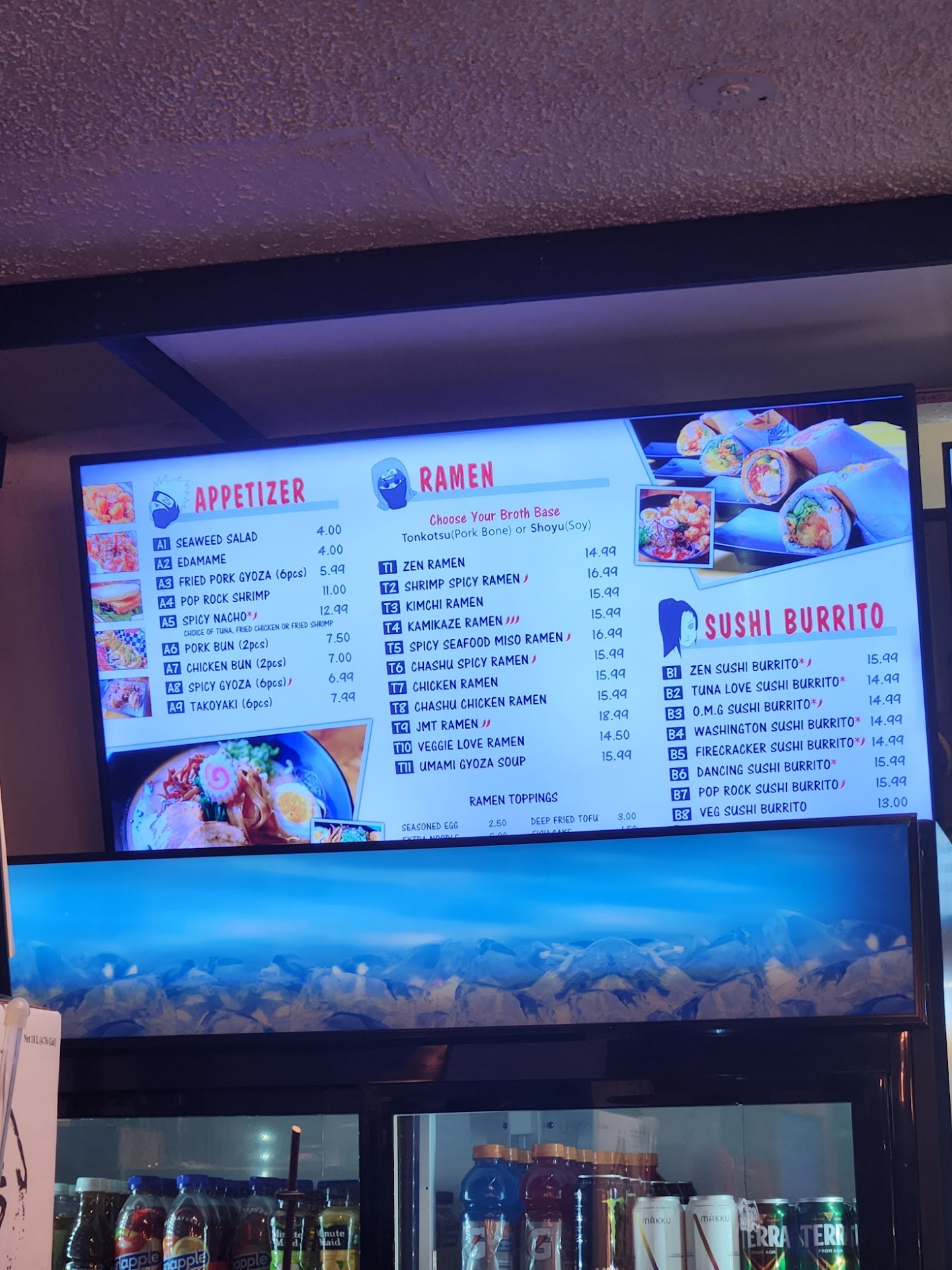 The food was pretty good except the ramen. The pop rock shrimp was fun and zesty as it is topped with Thai sweet chili, spicy mayo, furikake flakes and sesame seeds. My boyfriend enjoyed his WA poke bowl and loved the presentation. Now for the ramen, the JMT ramen is indicated with two peppers which indicate that it is supposed to be spicy. My boyfriend was able to get several samples as I didn't know the shrimp that was coming with it would be fried and even he was confused as to what was spicy. I asked for chili oil or the little spicy flakes you see at other legit ramen places, they only reply with it being extra .50 cents. Additionally, she didn't even ask which broth base I wanted and I suppose I was given the tonkotsu. Here is the other issue, the ramen broth lacked any depth of flavor. I had the tonkatsu kamikaze before and it was not only spicy but delicious. Unfortunately, the JMT ramen had neither and also had these weird white specs floating about. I saw another photo of the JMT ramen and it had the same thing. Never in my years of having ramen at restaurants have I ever ran across this issue. Additionally, the toppings were super cold which completely threw off the dish and the ramen broth was lukewarm. The egg is also fully cooked and not the gooey ramen egg that most good ramen places have. Zen Ramen & Sushi Burrito seems to excel at all other dishes than ramen it seems. I have learned my lesson and avoid...