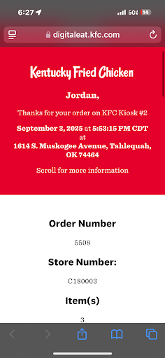 Read moreI gave 2 stars. Reason being is bcuz the staff forgot...FORGOT!!! about r order. We waited a good 35 minutes for r order, and I had to go to one of the staff to REMIND them that we didn't get r order. They didn't apologize, and when r order was brought to us, it was just put down on the table...there was no "I'm sorry for the delay"..nor "I'm sorry for any inconvenience." The place wasn't crowded or too busy. There was 3 ppl ahead of us and 1 after us. They all got their orders in a timely manner...but not us. What's up with that??!!! Other thoughts come to mind which I'm not going to state here. But I don't think I will be going for lunch here again. Ok..I said I wouldn't have lunch here again...I had dinner here bcuz everyone I was with wanted KFC. This time the service was alot off the mark. I ordered the 2 piece meal with a drink. My daughter ordered the tenders and her dad ordered a 2 piece meal. Only one order was right. We weren't given any sporks....there was no biscuit with r meals...one of the 2 PIECE meals came with only ONE piece of chicken. Sorry to say but I lowered my rating from 2 stars to a 1 star. This used to be my fave place for chicken but it seems the service here is steadily going downhill. Plus the place wasn't busy at all. Maybe they just don't care how they serve the...