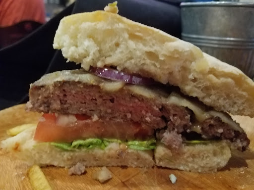 My food was pretty decent, the burger was big, as advertise and the fries were drenched in garlic oil.. I'd say the burger was a little dry though, kinda hard not to be when it's that big. I also got some honey rings because I split the burger with my partner, the onion rings were excellent. The homemade ranch that came with was fantastic.