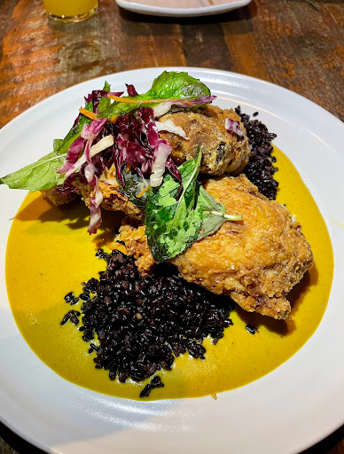 Their Curried Fried Chicken (Fried chicken in a curry sauce, forbidden rice-a heirloom black rice, Madraâs curry, & a crunchy herb salad $23).
