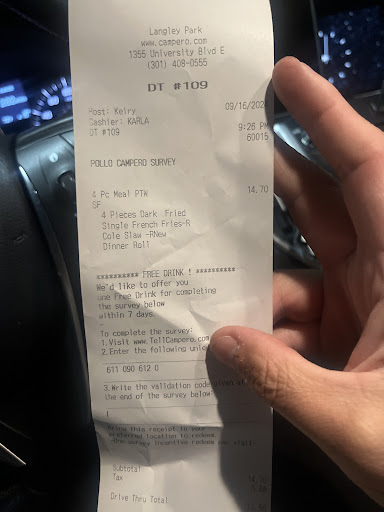 Read moreI was at the Langley park location I place my order they told me I had to wait for about 10 minutes for the chicken because it was cooking. I said it fine then when I get to the window I payed and I asked the cashier if could have a curtesy cup of water because I had my 8 years old daughter that was thirsty. The cashier told me that they don't have curtesy cup only regular cups and that she could not give some water. I told her that I have not her i have not heard restaurants don't give you curtesy water especially been in this area " Langley park " I asked her if I could talk to manager she went and ask the manager and when the manager told her to give the cup of water this girl was very upset. The cashier's name it Dinayda and this review it is for that Managers to train better...