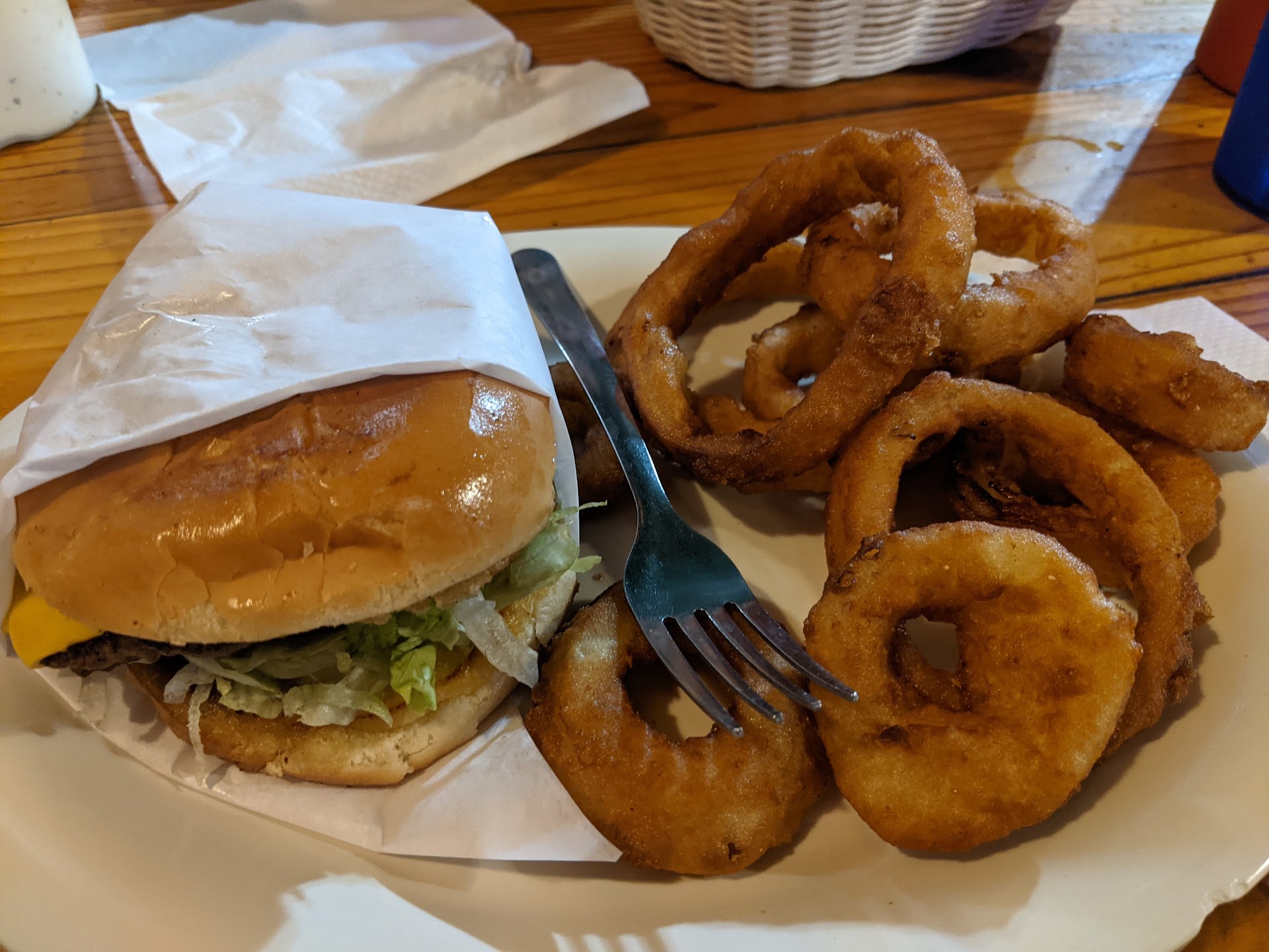 Read moreServers were nice and helpful. The restaurant has a nice, small town vibe to it with locals dining. It's located in a strip on the street with other buildings. There is a for sale sign hanging in the window. As you are waiting for your food, make sure and read the signage through out. It's funny and fun. I got a burger and onion rings. Definitely a pass on the onion rings. It wasn't your crispy batter and the rings were more of a rubbery than crispy. The burger had the buttery bun and was your diner good burger. My daughter had the catfish dinner. She cleaned her plate. The catfish looked crispy and the crinkle fries were on point. I kept taking a few of hers to make up for my onion rings. Her meal also came with a garden salad and a basket of crackers! Prices are super cheap. $16 for our meal. So make sure and tip...