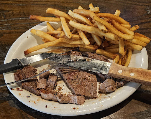 After that, the food showed up, and while good, I have never had such a flavorless ribeye steak ever. Even with the provided spices that were available. No matter how much seasoning was on the steak. It still tasted like someone literally stuck a bare steak in a frying pan full of water and cooked it on an electric range for half an hour. Without adding any spices or seasoning to it at all, and then pulled it off and stuck it on a plate, and said, that will do it. What?