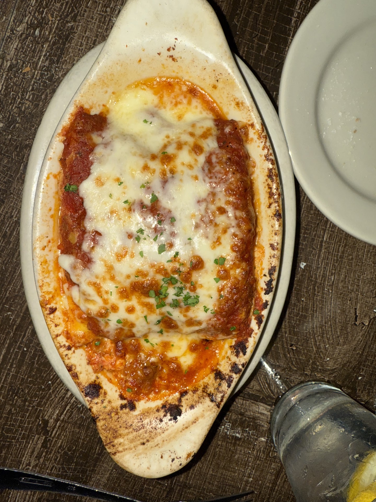 My Eggplant Rollatini was also excellent, although I only ate a few bites because I'd filled up on starters. However, the leftovers reheated well, and I've made two more meals out of it and the angel hair and marinara that accompanied it.