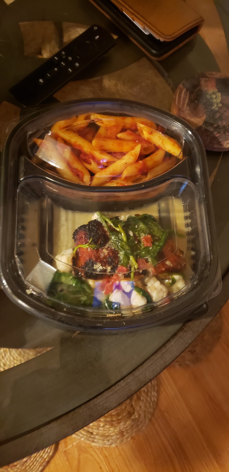 Food arrived Sarah's house salad with creamy Italian dressing arrived. Normal salad gererous proportion. My minestrone soup arrived. Dressing was tart. Soup was good, but needed more liquid. Very tasty.