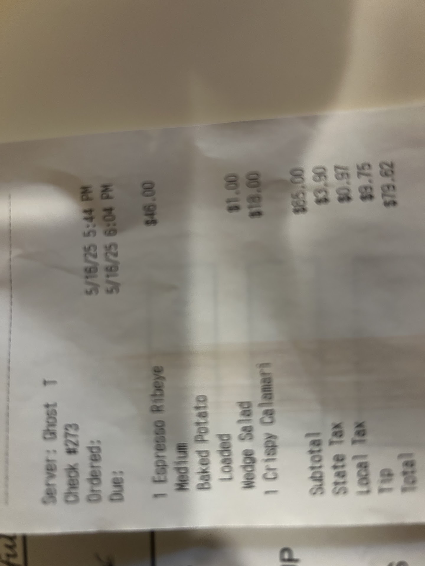 Monumentally bad service!! On Friday, May 16, after an unusually hard week, my wife wanted a nice dinner at home, curled in front of the TV. She decided it was the right time to try Connorâs, Tallahasseeâs upscale (i.e. expensive) new steakhouse. At 5:44, she placed an online order, a simple order of a steak, baked potato and calamari, with a promised delivery of 6:04 (see photo). Unfortunately she prepaid. We arrived at 6:00, and I went in to get her order while she waited with our dogs in the car. I told the young woman at the front desk that I was there to pick up my wifeâs order, giving her first and last name. I was told to wait at the side. So there I stood, the single small bench being occupied. After about 10 minutes, the woman from the desk came to assure me that the kitchen had my order and knew I was there. I then proceeded to wait. And wait. And wait. I was dressed in my casual Friday professional work clothes. A man with an earpiece (manager?) circled the room, passing me every so often. Not once did he make eye contact. Despite standing by the bubble machine at the front door, a prominent location, nobody came over to ask if I needed anything, no offer of a glass of water. Nothing. After 30 minutes I was pretty irritated, but became interested in how long I would be ignored. The number of people who walked by me numerous times, including the woman I originally spoke with at the front desk, while purposefully avoiding eye contact, was amazing. Finally, after 50 MINUTES of waiting at that prominent spot without any further acknowledgement, I asked the woman at the front desk who earlier assured me that my meal was coming, more politely than I should have, where my order was. One of the desk staff went back. A few minutes later, a server came out and asked, again, what order I was there to pick up. I gave her the name. She came back out shortly thereafter, and explained that the order had been given to the wrong person, returned, and sent back to the kitchen. She had the order, admitting it had been sitting for 15 minutes, though since it was 6:50, I know it was longer. She offered to take it back and have it warmed up. Seriously? Being in no mood, I took the order and left. But for the poor server, no one offered an apology or an acknowledgment. This after ignoring me for 50 minutes. Obviously, when we got home the food was ice cold, the calamari, which came with no sauce, was limp and greasy, and the steak, ordered medium, was well done, without a hint of pink, and overly charred. As my wife correctly noted âan expensive meal ruined.â How a wannabe fancy restaurant could leave a customer to stand around without so much as a glass of water, and without any effort to see what the issue was, is beyond me. Iâm just happy I opted to clear some leftovers for dinner so I didnât get stuck for two cold, poorly prepared, lousy meals. Iâm sure Connorâs will take the money of many Tallahasseans, but after tonight it wonât again be mine. Word to the wise - if you order takeout, leave yourself an out and donât prepay. The one-star review is only because the scale...