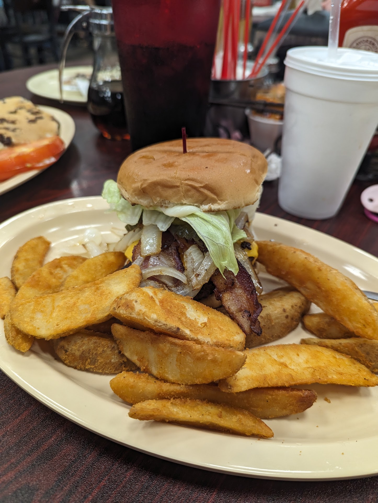This is a classic Diner. They have excellent prices with a salt-of-the Earth clientele and staff. The entree of each meal is cooked fresh to order but the sides are showcased in a display that you can peruse before ordering. There is high-bar seating as well as table seating. Daily dinner specials make the price even better. The portions are your average homestyle full plate and maybe a bowl on the side as well.