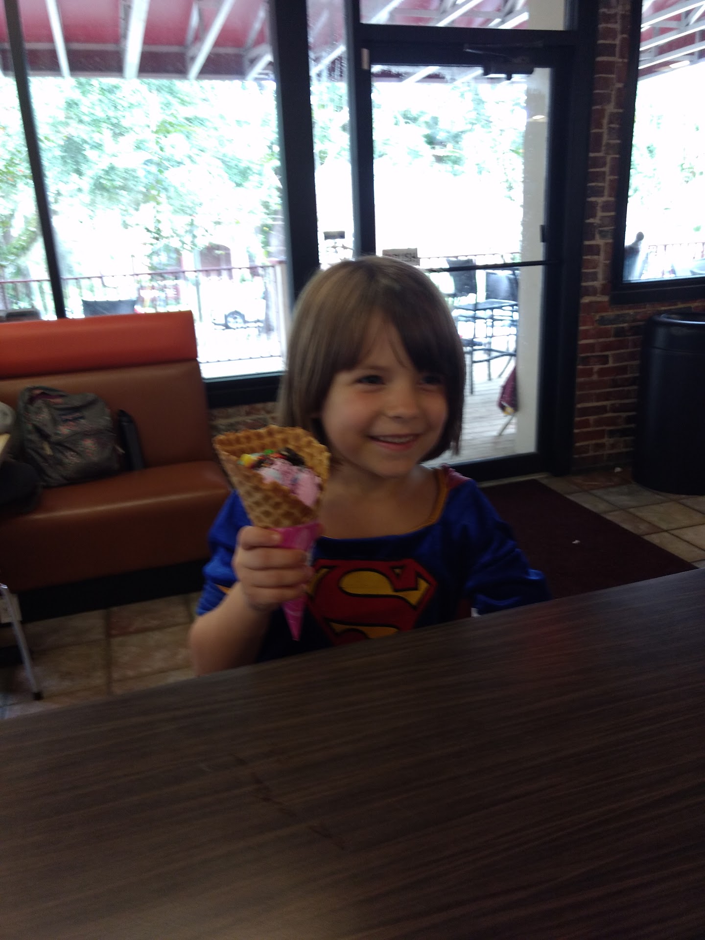 My daughter is 6. She bravely had a flu shot today, and channeled the Superwoman costume she's wearing! We went to Haagen Dasz, and oh my gosh there isn't a store there! So, off we went to Baskin Robbins. Parking is a pain the in @ss, but we found a spot. I used to hang out here, years ago, when it was just a convenience store. The bathrooms were clean (surprising), the counters and tables were clean. There was a decent variety of ice creams, from pumpkin cheesecake and German chocolate cake, as well as the Jamoca Almond Crunch that I so loved as a teen. My daughter asked for a cotton candy waffle cone, with all the toppings (and I asked that each topping be tiny). I got a pint of German Chocolate cake for Mom, and a small Cinnamon Sugar Pumpkin Almond milk latte. Holy cow, that was a tiny, sweet drink! The staff was so nice and accommodating. My daughter LOVED her cone and proclaimed this "best day ever.' We...