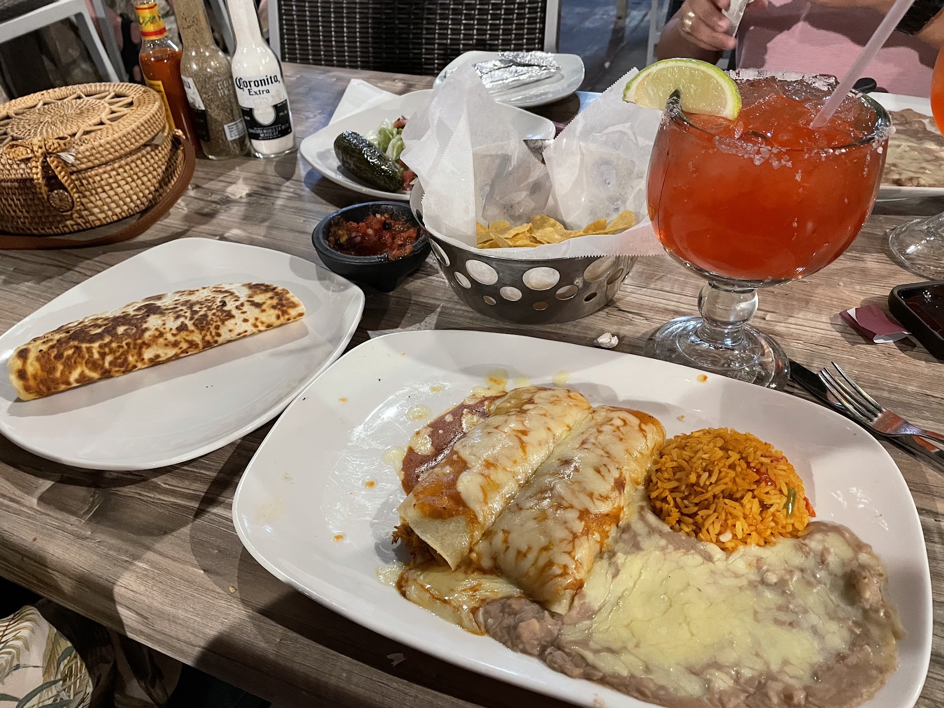 Read moreWe looked forward to eating here because of the reviews and a recommendation from a local family member, but our experience was less than good. If you have food allergies, BE CAREFUL. I specifically ordered my burrito non-spicy and with no cheese or sour cream. She repeated it back to me but the burrito arrived slathered in cheese and so filled with Jalapeno's I cut it open and dug out a few pieces of chicken, but couldn't eat the rest. My wife and sister-in-law ordered Margarita's, one with salt and one with sugar on the rim. Both came with nothing on the rim. My daughter and brother-in-law ordered street tacos with "chicken and cheese only" and they came with no cheese, buried in onions and cilantro, and the meat was so dry like it had been left out under a heat lamp for too long. For once, my wife's meal was perfect! Usually her order is what gets messed up. We don't live here so it won't be a problem for us to not come back, but they need to make some serious changes before someone has an allergic reaction because they didn't pay attention...