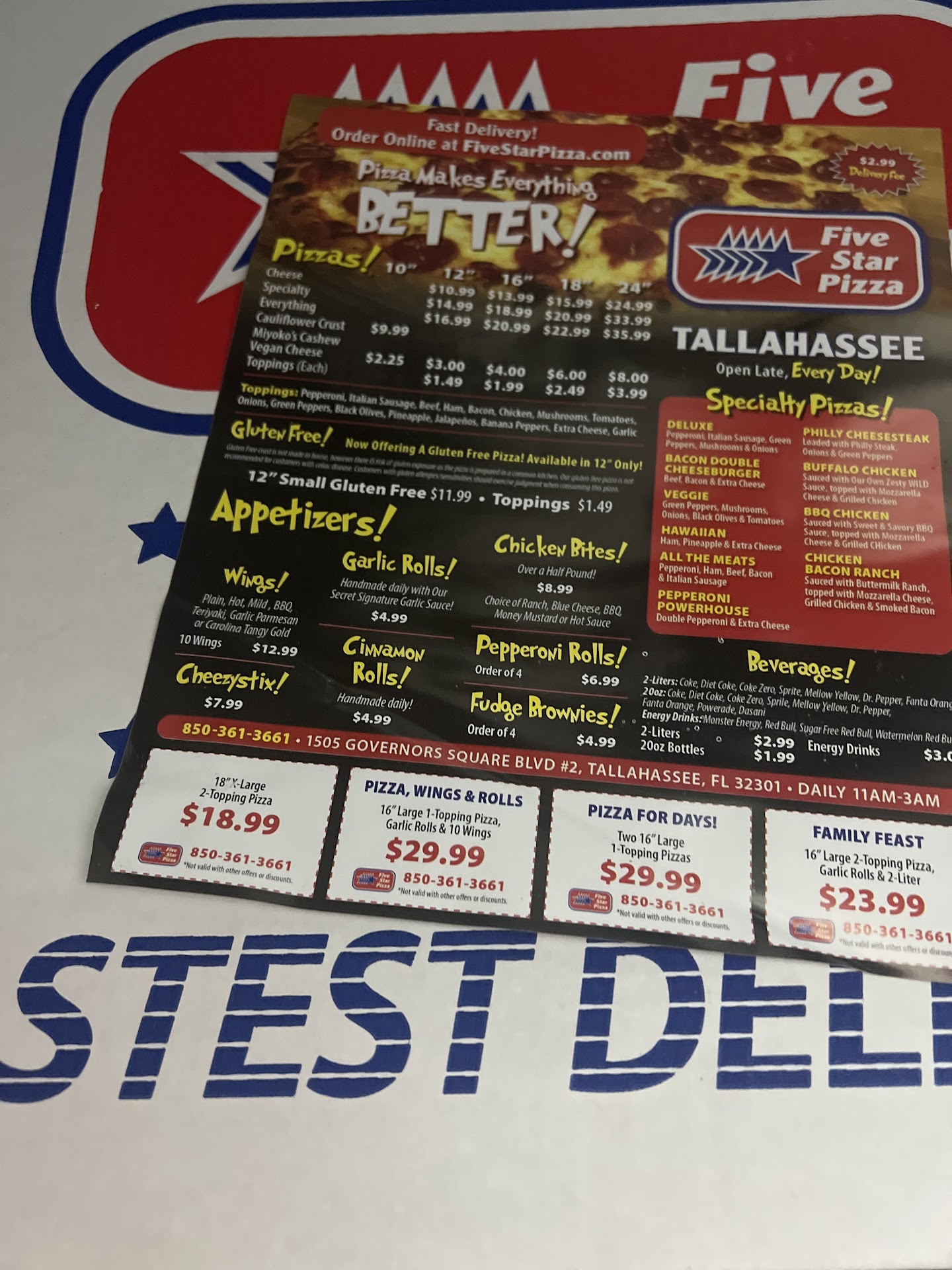 Read moreOkay so I wanted to go somewhere different instead of our normal pizza place. Saw Five Star Pizza reviews and noticed they had outstanding reviews. Pulling up to Five Star Pizza. I'm sitting in my car right in front of they window thinking about what I want to order. Now if you've been there you'll know they make their pizzas right in front of that window near the front door. So I already noticed the two employees male and female inside. The male employee was tossing a pizza dough with his bare hands as well as using his bare fore arms🤮🤢. I looked at my husband like 'Did you just see that'? Sure enough we saw him at the same time. At that moment I knew I wasn't ordering anything but I just sat there in disbelief. So the female employee came right beside him whom was dealing with a customer moments prior and stuck her bare hands inside what look like some big black container with cheese. I didn't see her wash her hands. Then she stuck her hands inside of a jar that looked like garlic she proceeded to squeeze the garlic in her bare hands on top of the pizza. Then sprinkled the minced garlic all over the pizza. 🤢🤮Now it don't take a rocket scientist to know that you suppose to wash your hands and wear gloves while handling other people's food especially. Given everything that's going on right now in the world and I have children I was not about to eat here. I'm glad I sat there and observed that before going inside.This didn't sit right with me Five Star Pizza y'all should do better....