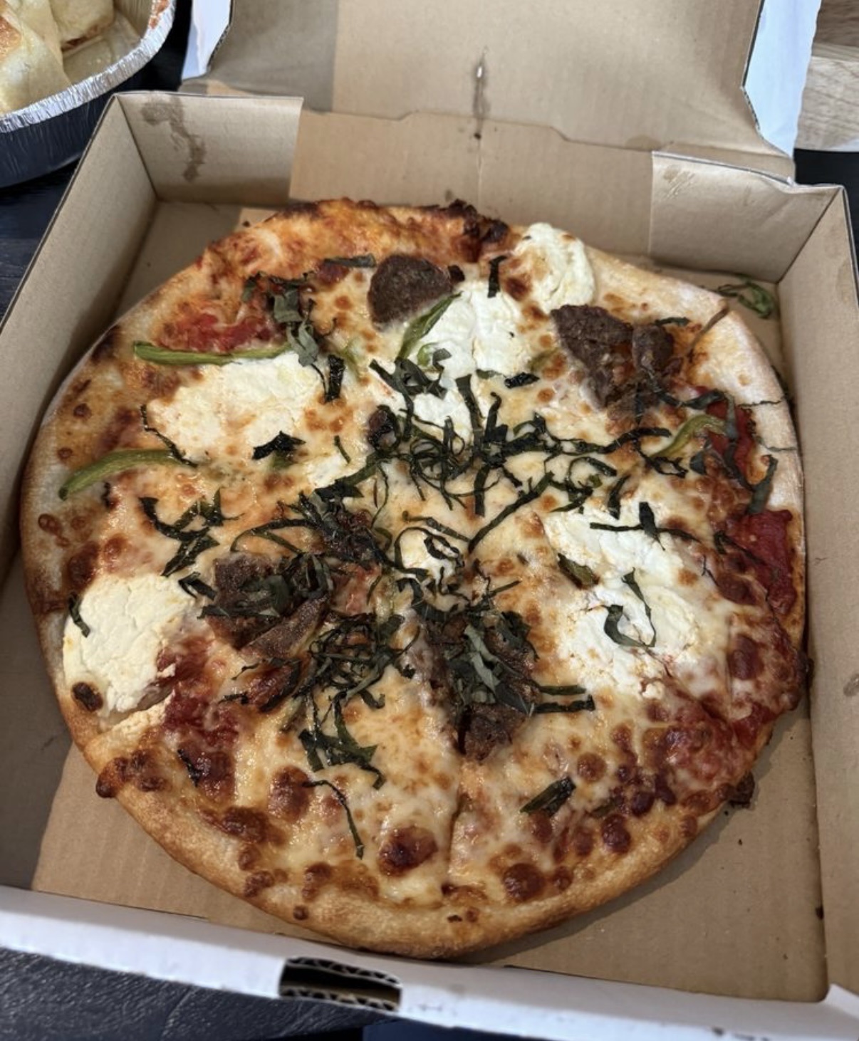 we were really hungry and watched people come in and out of the store with online orders. we were literally the only people there around 12PM for lunch and we waited about 35 min for our pizza to come out. to my disappointment there was cheese on the pizza!! if you look at the menu for this particular pizza it doesnt say anything about another type of cheese on the pie besides feta and it is also listed as a vegetarian pie. even their other regular pies list mozzarella cheese or whatever cheese topping there is on the pie. so i believe it was perfectly reasonable to assume that asking for the pie without cheese would return a pie WITHOUT cheese.