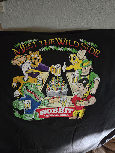 I truly hope that this reaches upper management and the owners. Last Thursday my wife and I were in Tallahassee for a very important doctor's appointment and were drove up all the way from Citrus County a little north of Crystal River, just over 3 hours. Appointment went fantastic but we were wiped from having to get up at 3 a.m. to be there by 7:45. After the appointment we had a little time to kill and we don't get to visit often so we decided to do a little bit of shopping but couldn't find ANY FSU apparel other than the highly expensive garnet and gold store. I just wanted to buy a local shirt from the mecca if you can understand that from a fan's standpoint but after 3 hours and several different empty stores I was feeling defeated honestly. Now that the picture has been painted for our mindsets walking in, this is where the 5 stars comes in to play. My wife and I are very tired, fairly hungry and just ready to be home honestly but we're not those types of people to take it out on others. We walked in, washed our hands and picked a table. Shortly after our incredible waiter came over and introduced himself, his name was Dustin ( hands down this guy is an asset and has a calling for what he does ) he asked how we were and I was honest with him and told him almost exactly what I typed from the beginning of our morning. I asked him if they sold shirts from their restaurant kind of expecting a NO but understanding that all the same as it might be a uniform thing. He took down all my information and submitted it to the manager on duty, her name was Akilah I believe and she was fantastic. She went & checked and I'm a very large man with a hard to find shirt size but some how she had it and a brand new design that even our waiter had not seen yet. Out of all my FSU shirts from being a fan since the late 80's this is at the top. I was going to apologize to for writing such a long review and I truly hope you've stayed this long to finish it because we honestly live in an often miserable world that people will write a novel on what went wrong but rarely for what went right. Today is different because a week ago was different. The food was perfect, the staff was perfect and Dustin especially along with Akilah changed my whole day around and the ride home that I was dreading was actually pleasant. We will return as much as we can, Hobbit American Grill (east) is our home restaurant in Tallahassee. We can't thank y'all enough for the hospitality and I'm ready for another shirt! Sincerely, Mike & Cherrie Sowell...