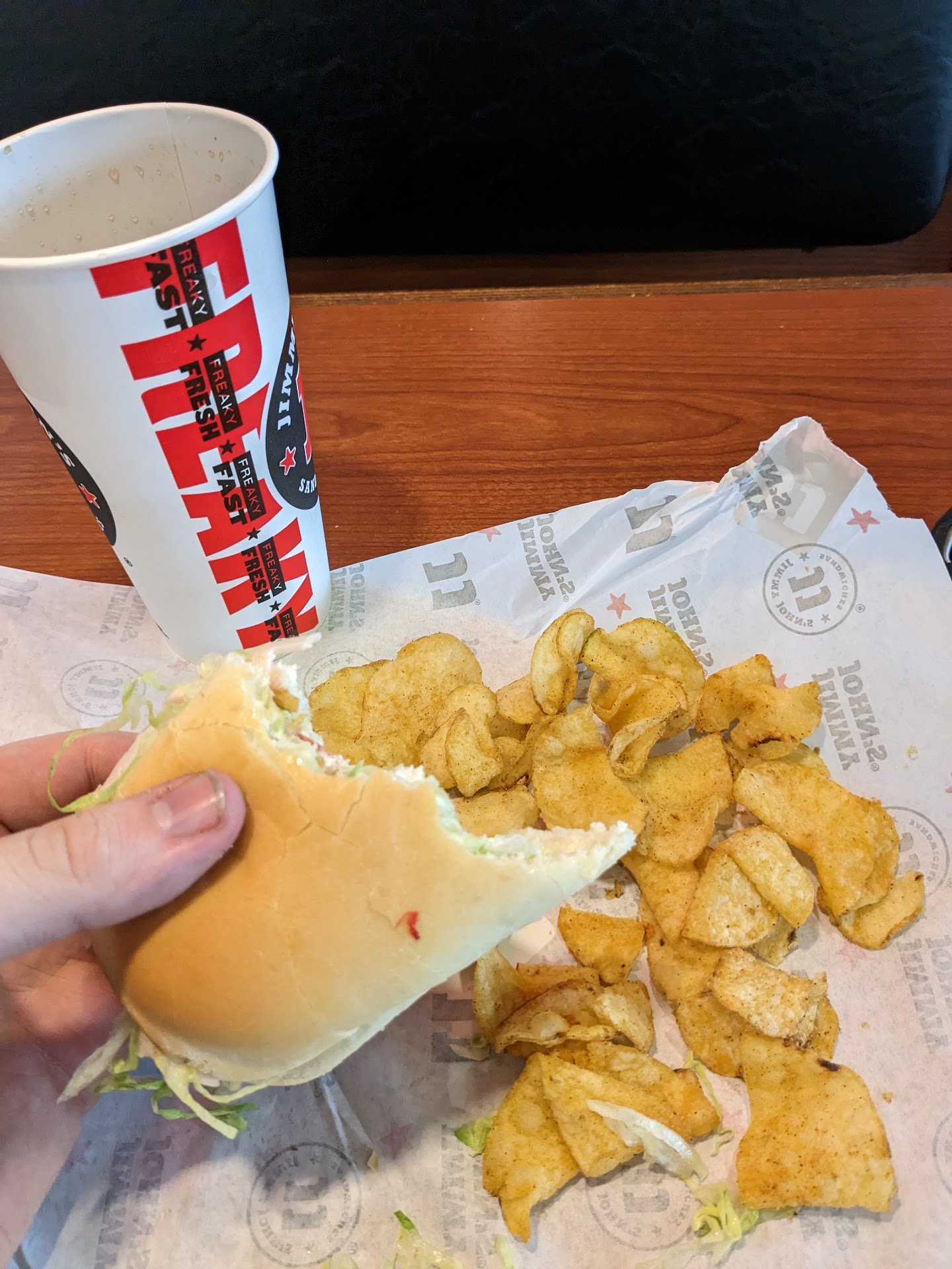 We came in with a group of five (two adults, three kids). When we got there, one of the staff members had a girlfriend/spouse sitting in a booth. That part isn't unusual. What's unusual is that she and the staff member were having a conversation that spanned across the entire restaurant and was going on while the staff member was working. The staff member left with his girlfriend/spouse a few minutes after we got there, but only after she climbed upon and stood on the back of a booth to unplug her phone that had been plugged into the same plug as the Jimmy John's logo sign. It was pretty obvious that this kind of thing happens very regularly.