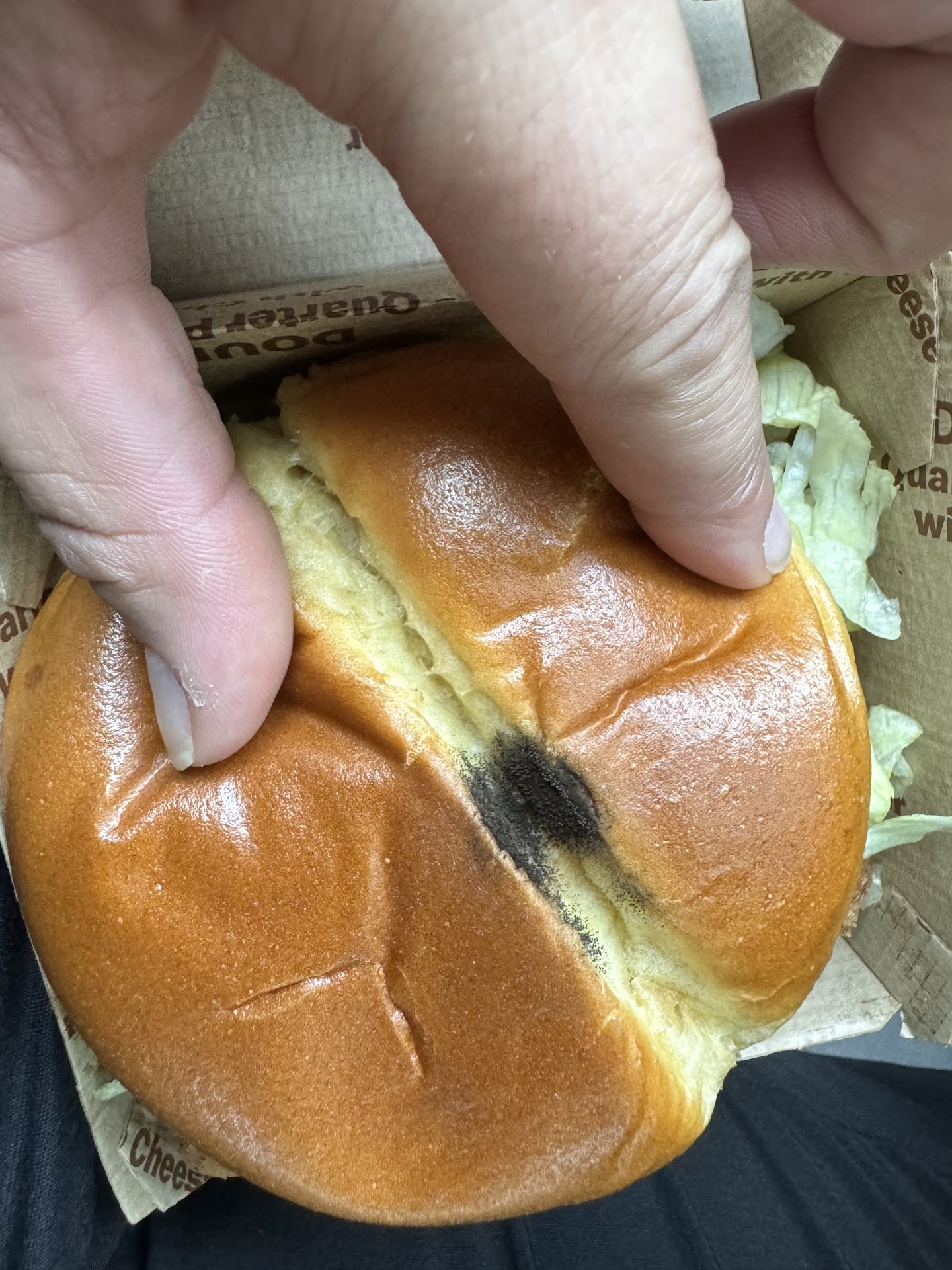 Read moreSome of the worst service Iâve ever had at a McDonaldâs. Pull up to order and it takes 10 min to get some one on the intercom at the menu so as I get to were Iâm about to just pull off someone answers and proceeds to say âwhatâs your orderâvery bluntly so I tell them and they ask âis that itâ so I pull up behind the next person who looks like theyâve been waiting for a good minute I pay then just sat there another 10 min, the person in front of me just pulled off after they paid so that confirmed theyâve been sitting there a while. I get to the window, nobody comes up for about 20-25 minutes and the whole time Iâm literally trying to get theyâre attention and they just ignore me the whole time so I had to get a little loud with one of them to get theyâre attention and ask âwhats going onâ just for the women to say she doesnât know. None of them had name tags so they know whatâs going on! After another 5 min talking to the women I go to pull off and go inside and she hands me my drink and my order and this is what I find on my crispy sandwich, MOLD that you can see very good so in total I was there for 40-50 min for some chicken just to have mold on it! Iâll probably be contacting the health department about this now! This is...