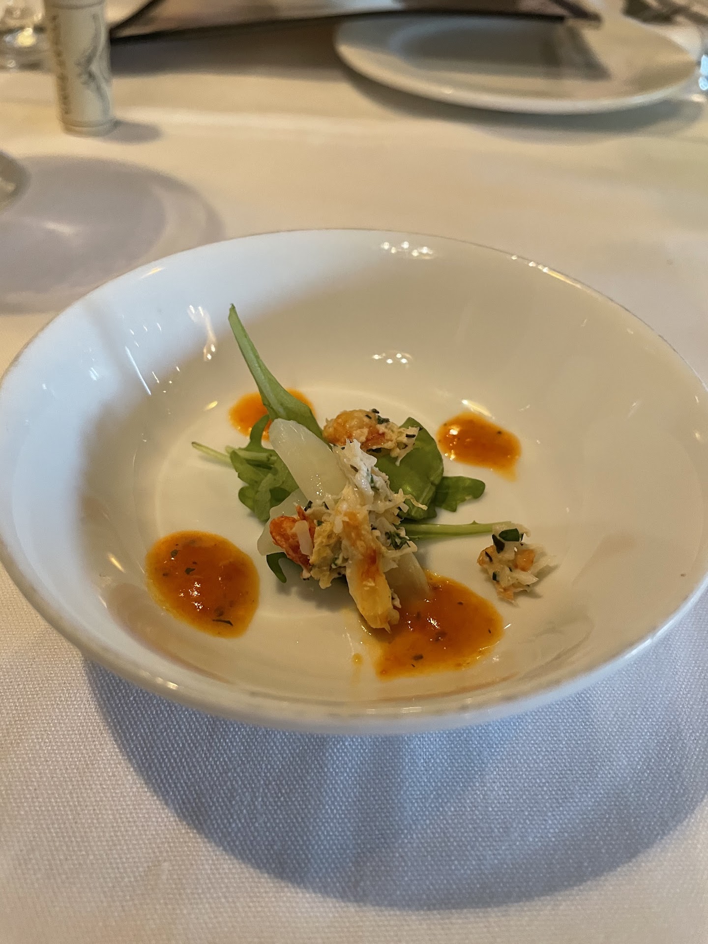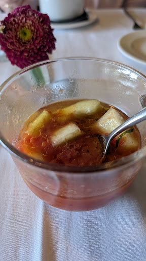 Our server, Natalie, started us off with an amuse-bouche: a cold watermelon soup with tiny, perfectly diced fruits and veggies. A tasty way to start the meal and a platform to showcase the outstanding knife skills of the kitchen.