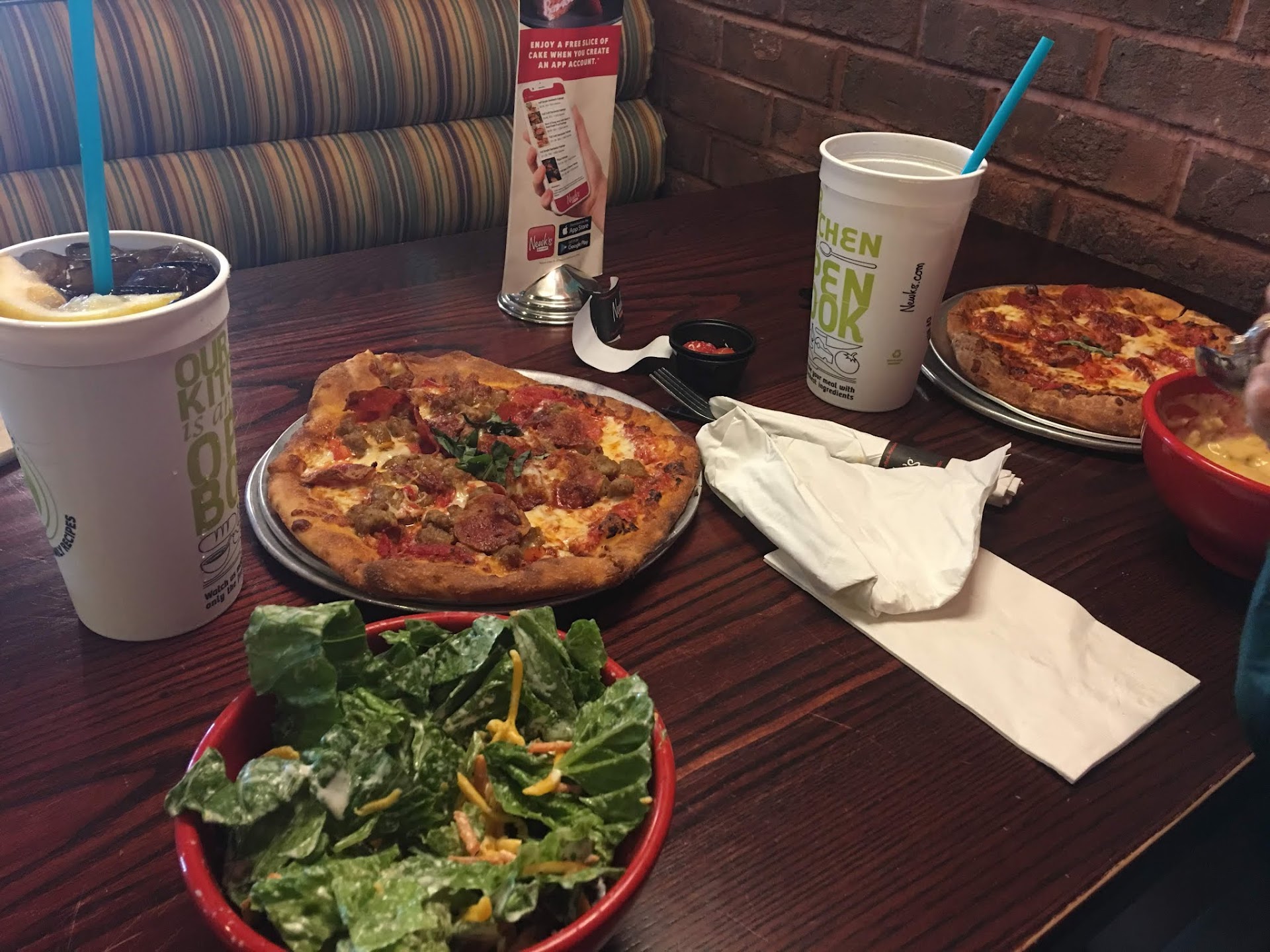 During our travels, we decided to stop in at Newks because we have always had great service and the food has always been great, too. However, this stop off for a bite to eat was not satisfactory. I knew I couldn't eat a full meal and we chose to share a large pairing: ordering a Mediterranean pizza with a half salmon Caesar salad, emphasizing a food allergy and requesting no croutons.