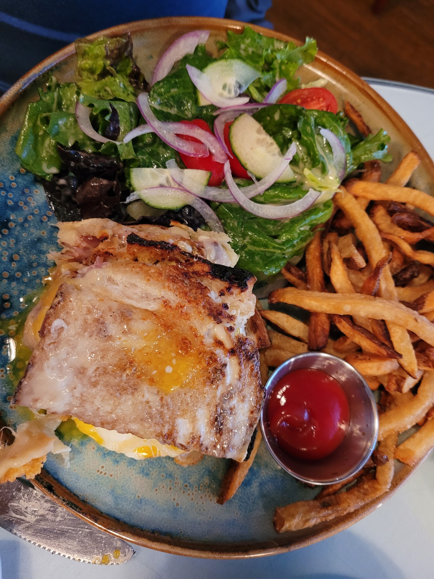 My daughter opted for the PEPPERCORN-CRUSTED SALMON, which was served with a pan roast of brown butter-braised carrots, brussels sprouts, and bacon lardons, as well as an onion-potato soubise. She shared my sentiment, describing her dish as equally lacking in flavor. The salmon, despite its promising crust, failed to deliver the expected peppery kick, and the accompanying components did little to enhance the overall taste. Feeling a little adventurous on her birthday, she also decided to order a cookie for dessert. Unfortunately, her choice did not live up to her sweet expectations. She found the cookie to be rather hard and lacking in the expected sweetness.