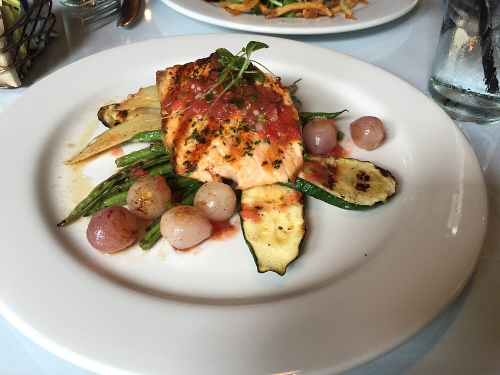 For my main course, I decided to try the TROUT AMANDINE, which was described as being served with red potato and exotic mushroom hash, haricot vert, and toasted almond brown butter sauce. The description sounded delicious, but the dish itself was surprisingly bland. The trout lacked the expected flavor, and the accompanying sides failed to complement the dish adequately.