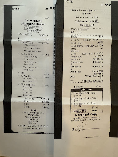 Read moreBEWARE OF FRAUDULENT CHARGES! I ordered takeout from this restaurant. My total charge that I signed on the receipt was $59.61. When I received my credit card statement, the total amount charged to my card was $69.59. I called the restaurant and asked them to email me a copy of their receipt and they told me they could not do that so I back charged my American Express to dispute the charge. During the investigation American Express found that they had added a $10 tip without my approval and without me knowing. I will never go back to this restaurant and highly recommend that you look at your credit card statement to see that they are adding tips that you are unaware of. What a SCAM!