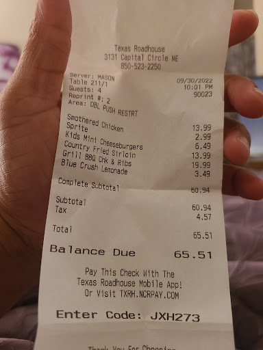 Read moreUsed the online wait list. It was perfect for us, as we live about 45 minutes away. We were seated only 5 minutes after parking. Casey was our server & he was very pleasant. We ordered drinks. When Casey delivered our drinks quite a while after we ordered, he apologized for the delay. He took responsibility for the delay. That was a plus for us: he didn't try to pass the buck, but owned up to his mistake. The place was busy, so there was also a delay in receiving our food. My boyfriend ordered medium well steak, I ordered medium rare. His was a bit more well than he preferred. Mine was EXTREMELY well done, nowhere near medium rare. The plate was completely dry, no juices, and when I cut into the meat it was completely dry. I explained this to Casey & asked for a manager. It was comical that Casey asked if I wanted a replacement. 🤦♀️ Yes please. When the manager arrived, I expressed the online wait list was very successful for us, Casey was a pleasant, honest server. Then I explained the horrible steak issue and asked what he was going to do to correct the situation. His statement was "I will definitely take care of your check tonight". I didn't want him to think that I expected a total comp of the meal, and told him the salad and green beans I had eaten were delicious. He thanked me for being understanding, even though I had not had a good experience. When he returned, his idea of taking care of our check was a $30.00 'guest satisfaction certificate'. It's good for 90 days, can only be used as dine in, and excludes alcohol, taxes, and gratuities. So your response to a bad food experience in your establishment is to force me to return to your establishment, on your time schedule, to try again? I was in such a state of shock, and hunger, that I put it in my purse and left. I am VERY displeased with this 'solution'. Clay Parrish appears to be the manager's name. Texas Roadhouse, are you going to do anything to truly rectify...