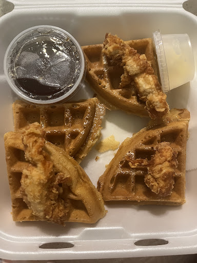 I ordered Chicken and waffles and this is all of the chicken I got. They charge $10.00 for three tiny pieces of chicken. I would get more chicken in a damn Happy Meal.