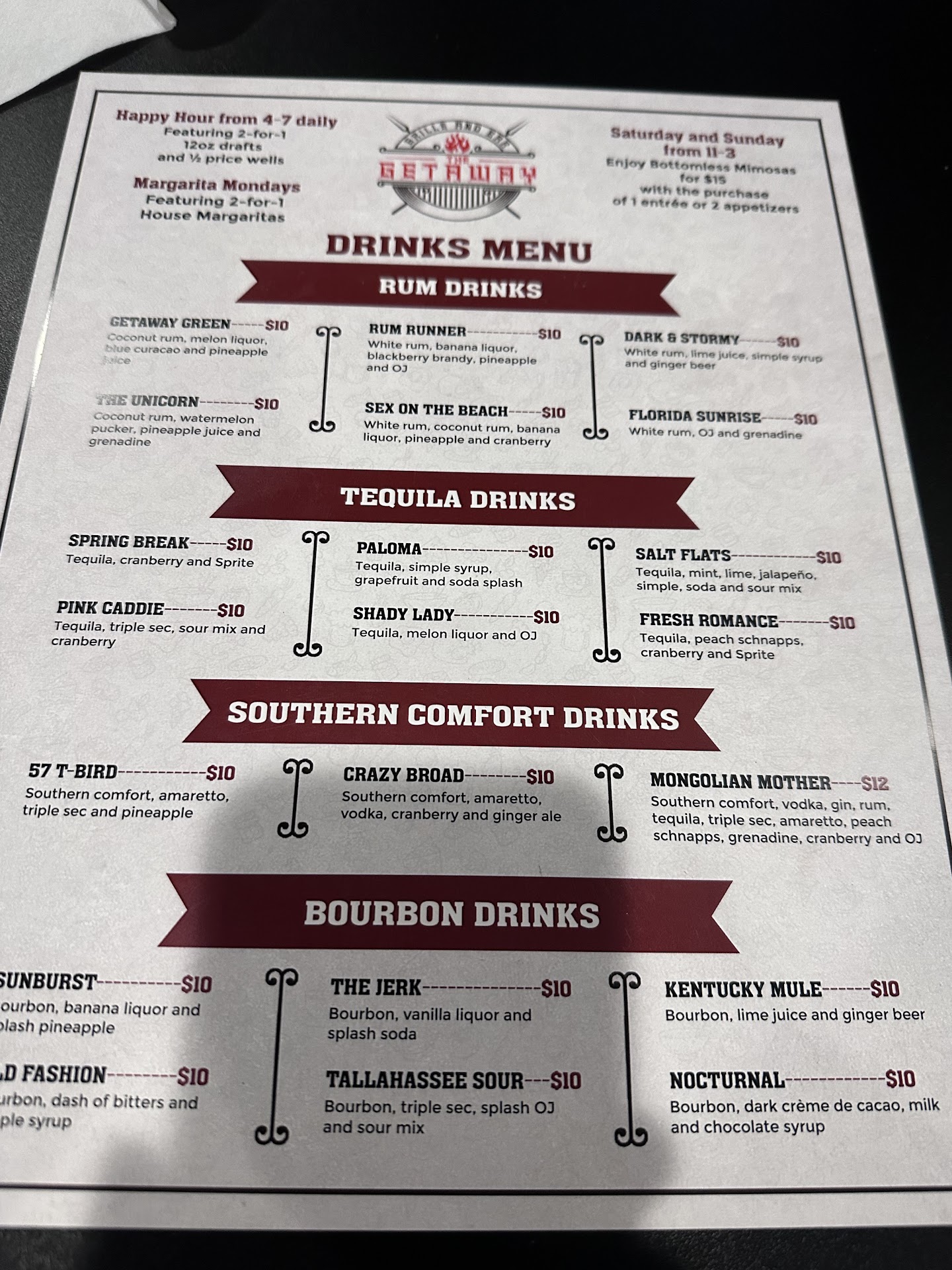 Read moreI have heard great things about The Getaway Grille and Bar, so I decided to give it a try —— WOW, WOW, WOW. A phenomenal experience —- top notch food, great service, great staff, warm and appealing ambiance. It has counter seating, inside table seating, and outside seating in their shaded beer garden. Music on weekends, and every Tuesday night is “Tuesday Night Bikes and Trikes” with specials. Who goes here —- everyone, from the very young ( babies are welcome ) to the very old ( just like me, teetering into antiquity…. LoL ), those dining solo, those on a date, those dining with a group, those dressed casually, those all dressed up. In short, everyone feels comfortable, everyone feels welcomed.