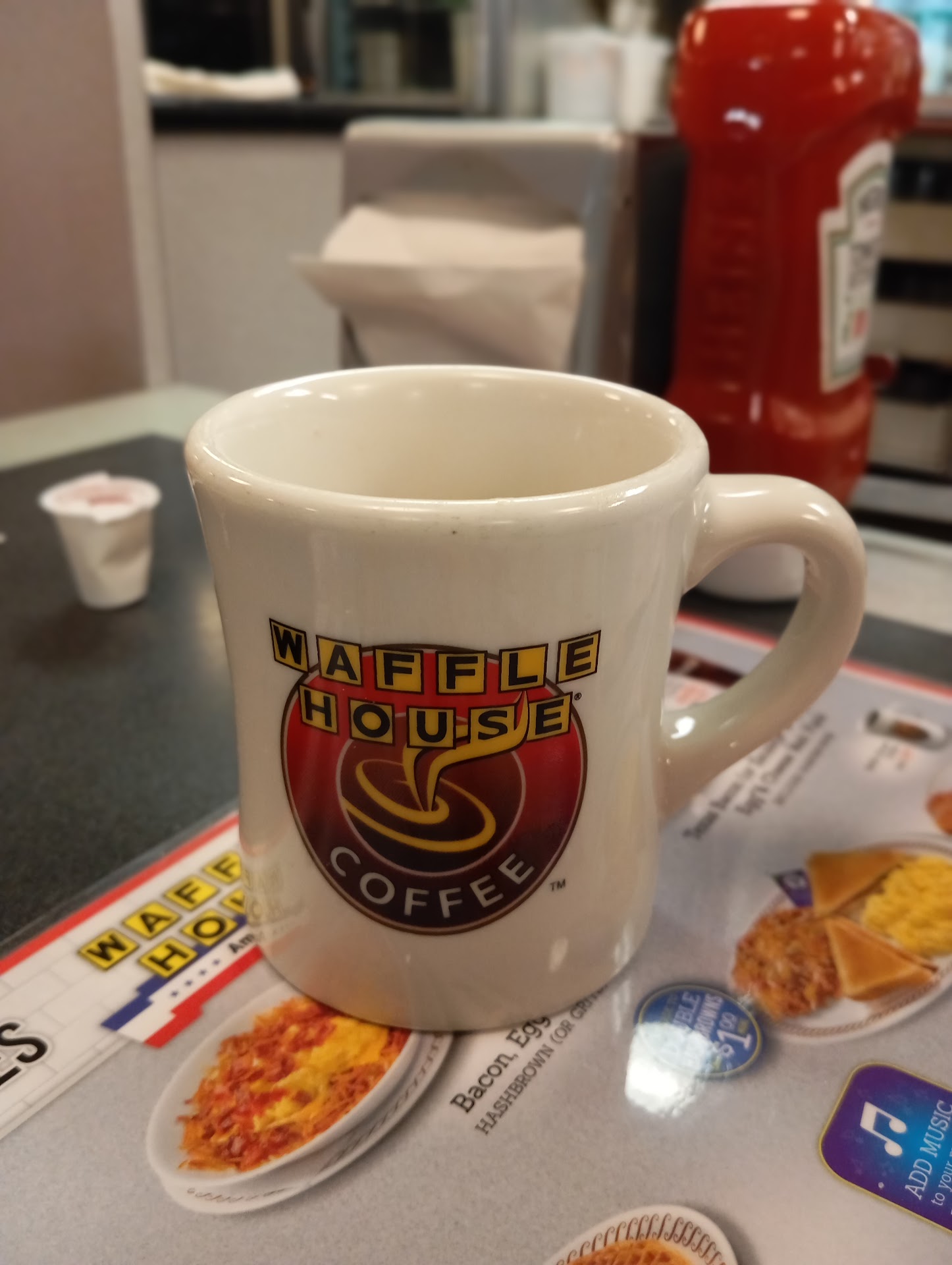 I never expect much from any Waffle House, but this particular one was absolutely, hands down the most filthy & disgusting one I've ever seen! There was food all over the floor behind the counter & under the grill. I bet they hadn't swept or mopped those floors in months! The booth was dirty & sticky. The ketchup bottle had disgusting old ketchup & God knows what else stuck all over it. The napkin dispenser looked like it had never been cleaned since opening day. It had caked food & other grime all over it. The waitress didn't even know the menu. We had to repeat or explain our orders numerous times & show her on the menu what we wanted. When the food came, two of the three orders was wrong. There was only one other table of four in the entire restaurant. The cook brought us our food. We had to ask another girl who was stocking for drink refills & jelly. Our waitress finally made an appearance as we were standing up to leave to throw the check on the table. The bathroom was quite lacking as well. The water barely trickled out, the sink was disgusting, the paper towel roll was placed on the back of the dirty sink by the hot water handle. They were wet from people washing their hands & splattered...