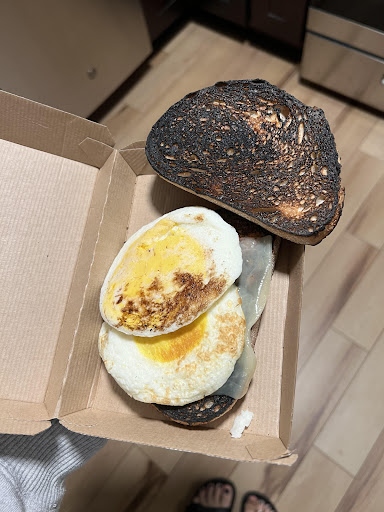 Read moreOk so while I generally only jump on here to heap praise on positive experiences, I'm pretty disappointed today and I've got one heck of a visual to back it up. I cruised through the drive thru here this morning to grab my usual favorite (the new-ish Sourdough Breakfast Sandwich) after getting up at 3am to drive someone up to the airport. I was so ready for my breakfast but once I got home and opened it up - this is what I got. Like, COME. ON. I know every place has its struggles and being a frequent flyer at this Dunkin' I know this one has them somewhat often but again - COME ON. Who on Earth OK'd THIS ONE to go out?! I did note that the two blackened sides were even turned inward, as if I wasn't going to notice, but LOOK AT IT. I do usually open it up when I get home to put some hot sauce on it but really, anyone could see this from space.