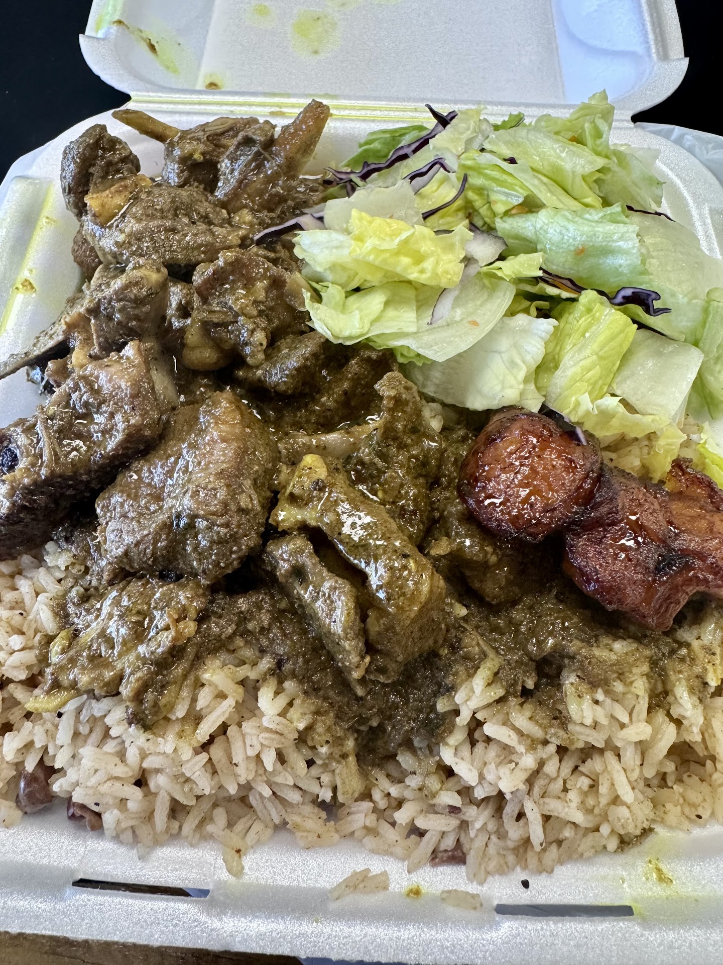 The curry goat is the best I've ever had but also the most spiciest. Lovers of pepper will love this one while those sensitive to peppers stay away from the goat. The jerk pork is also the other standout meat on the menu. Not sure how they do it but it has that authentic over the wood fire jerk taste that you cannot get with the oven cooked jerk.