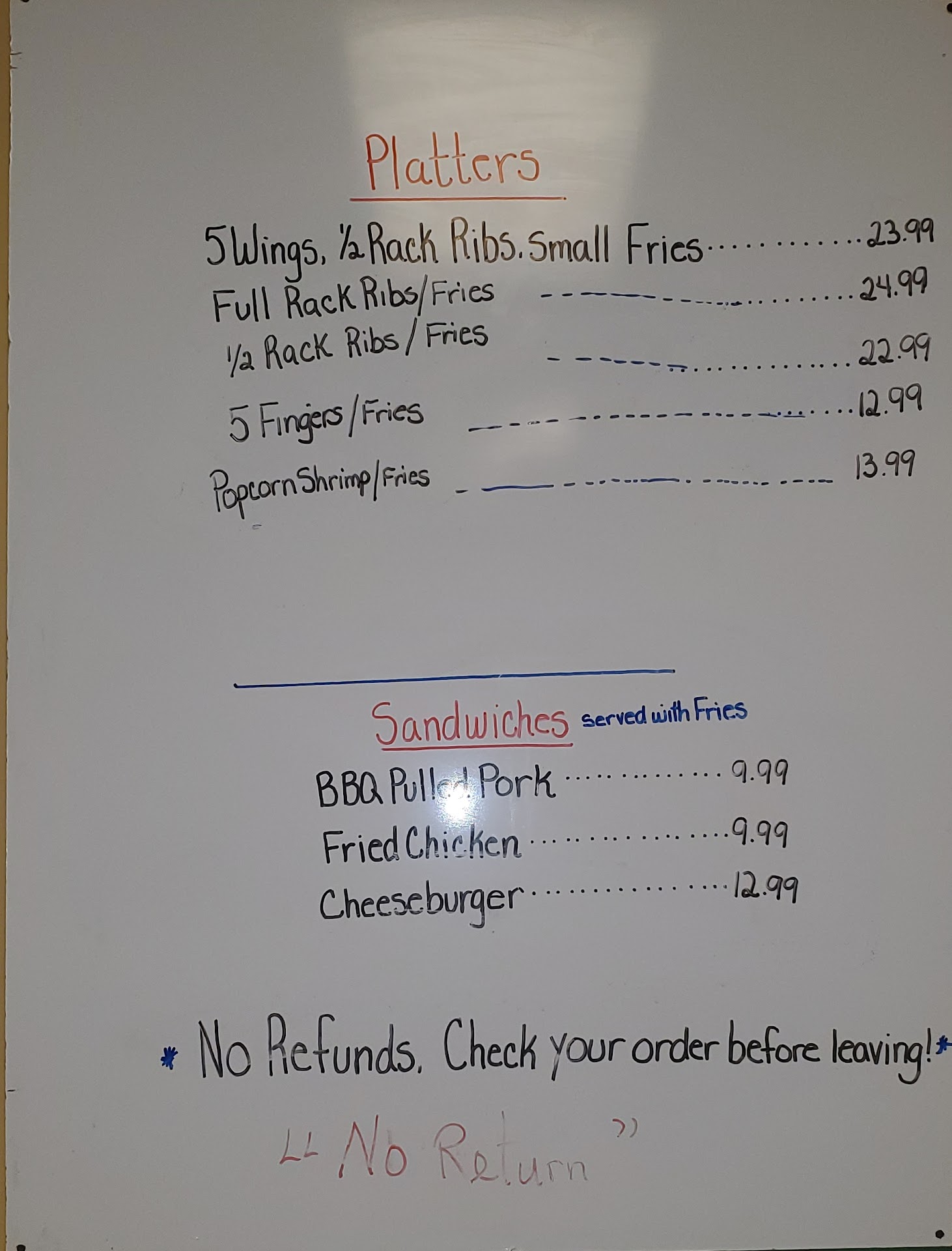 Upon entering, you'll be greeted by a friendly cashier. The menu is part of the counter so you can't miss it and contains a wide variety of items. They have lunch specials which include things like burgers, chicken sandwiches and wings. I opted for the chicken sandwich but they ran out so I ended up getting ten barbeque wings with curly fries. Drinks include a decent selection of bottled items in the cooler as well as fountain sodas. The lunch special was about $12, so not exactly a special.