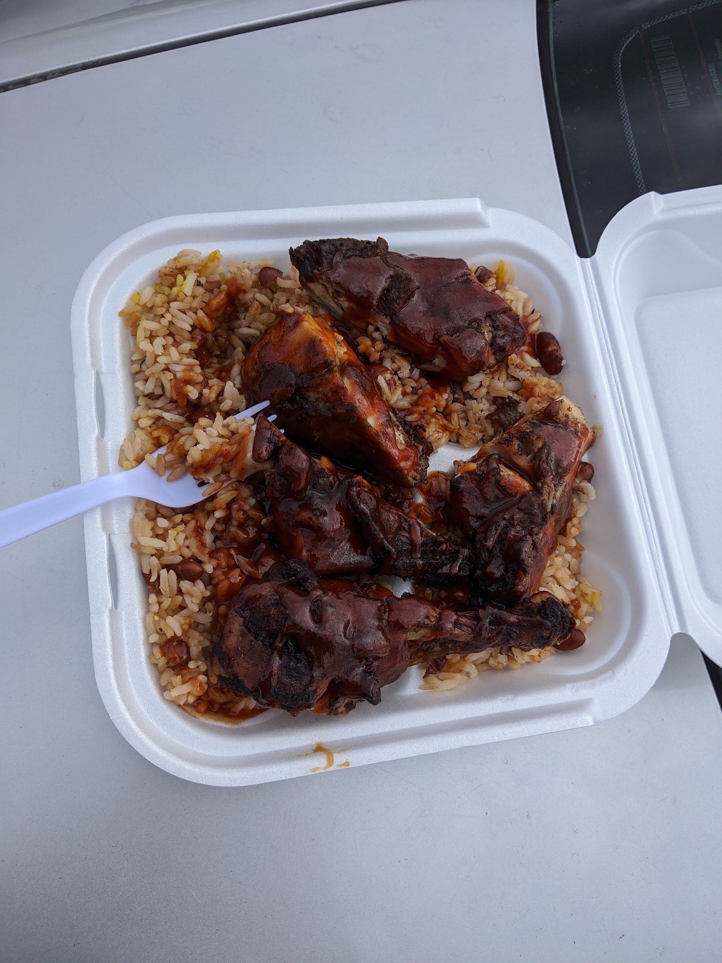 Read moreFirst off this is a greasy spoon if I ever saw one. I asked if he served jerk chicken since I did not want pork. He said yes so I asked for a dinner. I also got a jamaican beef patty and a bottled juice beverage. The only thing I enjoyed was the drink, maybe because it had Bob Marley's name on it! The beef patty crumbled after one bit into pieces my guess is old or overcooked. But what really upset me is that when I got back to my hotel I got pork spare ribs (fatty and greasy) covered with some BBQ sauce over a bed of nasty tasting dirty rice and a side of cabbage that looked disgusting! If I could give zero stars I would. save yourself a stomach ache or worst a waste of your hard earned money this...