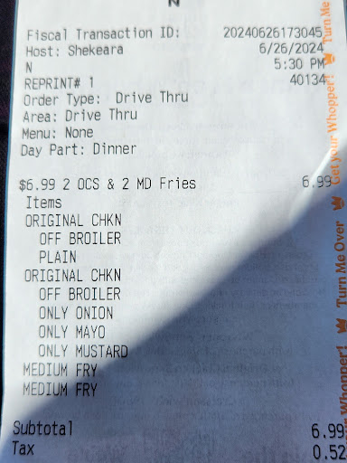As I am waiting for my food of 4 orginal chicken sandwiches, jr wopper & a few more items, it's late so i lean down on my elbows on the to-go counter inside the establishment, i see a manager for some reason take a few not just 1 but a few cooked burger patties, individualy put them on the silver like table, "work station" no paper underneath, but the space was filled with other food debris, takes a paper cup & used it as like a cookie cutter ON... THE... PATTIES... uhhhhm sir, ma'am what is he doing back there i ask? He says oh idk what i am talking about it's on a cutting board, starts getting really defensive about the whole thing. I ask the guy that rang up my order if my sandwich was already made he said yes, uhmmm please someone remake my sandwich or lets offer my money back niether was asked so i told someone to please remake, guy still in the back saying idk what i saw i saw it all wrong & wanted to keep arguing the fact that he was caught probably cross contaminating food buy also touching every other thing back there i was just glad at the end that i was able to see the guy that rung up my order remake my food & when a line girl bagging an order dropped a brown paper bag on the floor that was for drive thru, chose to get a different one & throw the other bag away. So needless to say- NOT RETURNING. & OH SIDE NOTE this burger king was just tore down & rebuilt to make this place better well it didn't make the people better. & i could really keep going on how not fresh my husband's chkn snd was...