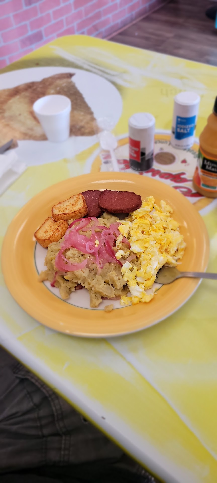 We wanted to try fun Dominican food for breakfast and this was our option! This place was a little tricky to find since the sign apparently blew off the roof and the sign said it was a pizza place. But, I don't give up easy and we were on a mission to try something new!