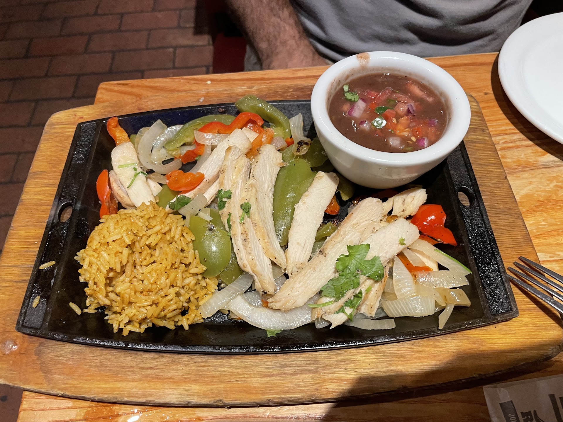 Between 3 and 4 stars. I eat at this location occasionally and it is usually pretty quick service and standard fair. The food is served hot and tastes as expected. Tonight we found that the menu has changed so if you have a favorite it may not be there anymore. Two for $20 has been replaced by 3 for me and the pricing varies by entre. I tried the cilantro-lime carne asada which came with black beans and rice. The steak was very chewy (had to spit out a few bites) and the seasoning was almost overwhelming. The black beans and rice were delicious and perfectly cooked. My husband order the “individual chicken fajitas” which may have been smaller portions than the old version but didn’t seem to be. They were the same as always except the cast iron pan did not stay hot long enough to cook the vegetables so he had to eat a lot of raw onion. Luckily, he doesn’t mind so his dinner was fine. For the appetizer we got the three dips for the chips not realizing that the salsa would be excluded. The server was kind and grabbed us a cup anyway. I ordered the chili for the first time ($1 up charge) and did not like it, VERY GREASY!