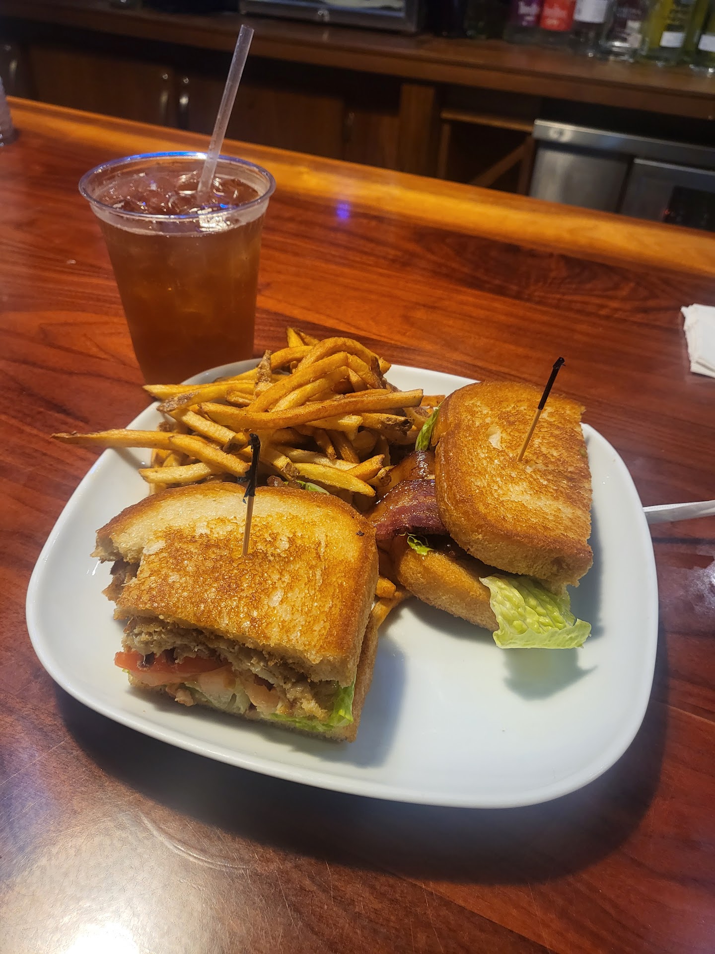 The grilled pastrami sandwich on marbled rye is different here, dill pickles, a mustard sauce and avocado. It was pretty good but the pastrami was almost crisp like bacon. The seasoned fries were odd. A large pile of very dark colored, mini shoestring type potatoes. I mean mini as in most pieces were about an inch and smaller and very thin. Needed a fork for those.