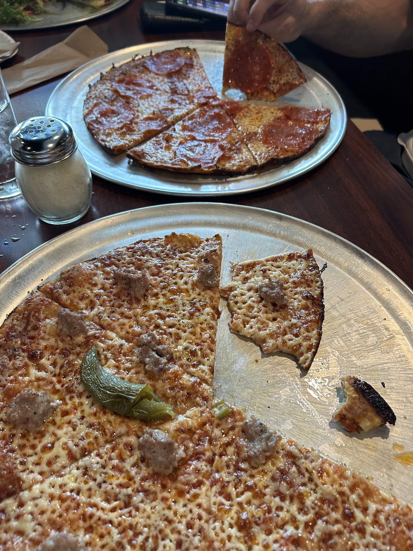 First up was the sausage, mushroom, onion had excellent fresh toppings. 5 stars for the toppers. As for the pie though. Felt it could have been a little more well done as the middle was a bit floppy. But it still held together well. A bit more sauce and tad more cheese would have been great, as the cheese was 'thin' and the sauce not at all in the flavor profile. But then, it may have been too floppy. So maybe you don't mess with years of experience as this is a tavern style pie done their way.
