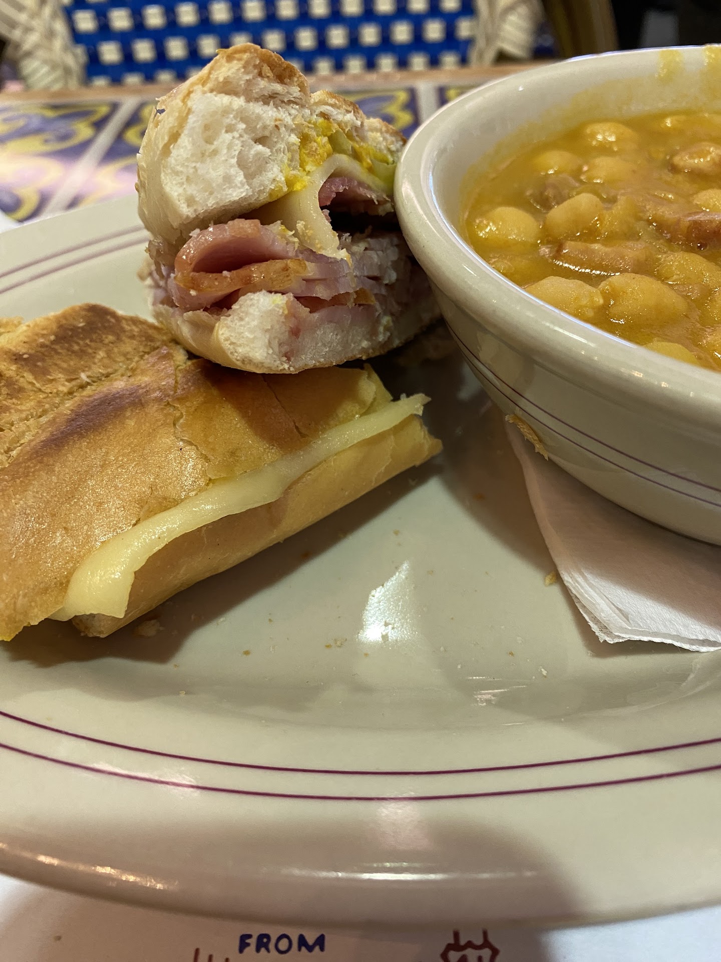 I decided on the half Cuban Sandwich, and the 1905 salad which is a must every time I visit the restaurant. I love the tableside presentation, while this does not happen at the airport location, my salad was still delicious. I received a Spanish Bean Soup by mistake, but hey, now I have a soup that was lovely and might be my new option when flying. Full of garbanzo beans, ham, chorizo, and potatoes. The broth was full bodied and thickens as the potatoes dissolve, loved it.