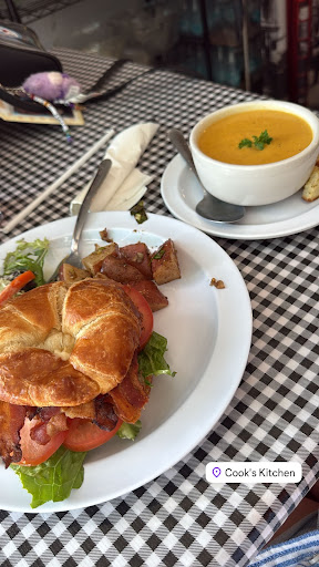 Read moreAfter a 6 mile walk from Harbor Island to the end of Bayshore I was definitely thirsty. Walked by Kojak's which I knew was closed then...and there it was... this quaint, unassuming, charming little place. From the outside, one can think that it is not even open for business if no one has parked at the front yet. Cook's Kitchen is precisely what the name implies. You walk in and you feel like speaking with a British accent right away. A few little tables with white and blue gingham tableclothes and lots of flags. Pictures of the royal family and a kitchen! Right there! and the red headed chef, a lady, yes... cooks discreetly for you. She used to be Chef to Fergie. Imagine that... and noe she is here with her family and you are so lucky... the quiches are to die for... especially the onion and bacon one! and the salads are so colorful and fresh. The fruit is juicy. The flag coffee mugs piping hot warm you. You leave the place belly full, mind at ease, and believing you had...