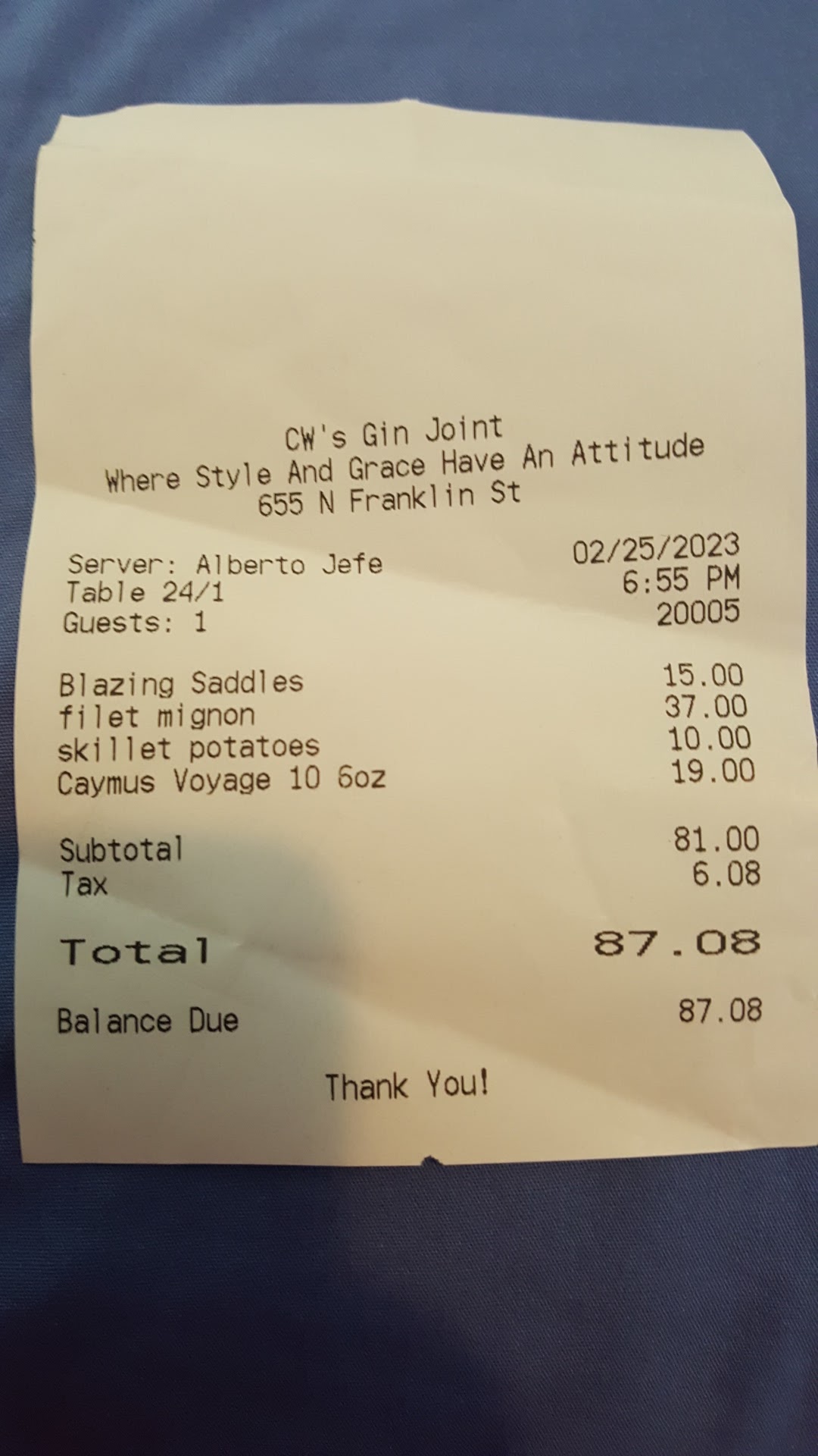 Read moreFriday Feb 25, 2022 my wife and I and another couple went to CW's Gin Joint. We were surprised that we were able to get a reservation within 24 hours for 4 at 7PM on a Friday. In the past we have not been able to get a Friday or Saturday night several weeks away. We live in downtown Tampa and go out to eat regularly. When we arrived at 7PM, there were at least 10 empty Tables, which surprised us and we were seated at a nice table. The waiter was responsive and did a good job. When he told us about the specials, he really harped on the Pork Belly appetizer and his explanation sounded delicious. Since I get Pork Belly at many restaurants, I did order it. In general, all the food was ok to good and in the past, it was much better. There was no music yet even by 8:30PM which just doesn't make any sense. The Pork Belly arrived, and it was not good, actually it was terrible. It was described as VERY crispy on the ends and moist in the middle. Some pieces were crispy on the ends or one end and the middle was not tasty and was chewy and fatty. I decided after tasting 2 pieces to send it back and the waiter was very accommodating. We left about 9:20 and the music did start playing at 9PM. We thought it was late to start music but so be it. We then got the check and was very surprised that the $14 Pork Belly was not taken off the bill. This was a $300+ check. I asked the waiter and he stated that executive chef told him to not take it off as I had eaten some of it. Shocked that he needed exec chef permission and I was annoyed and asked to speak the manager or GM. He said the Executive Chef was in charge of the back kitchen and the front of the house. That was another surprise and after waiting 10+ minutes she came by and did not apologize and took the stand that they were not going to take the $14 off the check. I was very disappointed and aggravated. She was also not professional and didn't care how I felt or if I wrote a bad review or if I told this experience on social media. She was arrogant and this was ridiculous and a very easy situation to resolve. The couple that came with us was never there and thought the food was just OK and that the mgt solution to the pork belly was absurd. So many more new places opening up in Tampa.!!! I suggest going elsewhere as this restaurant has definitely...