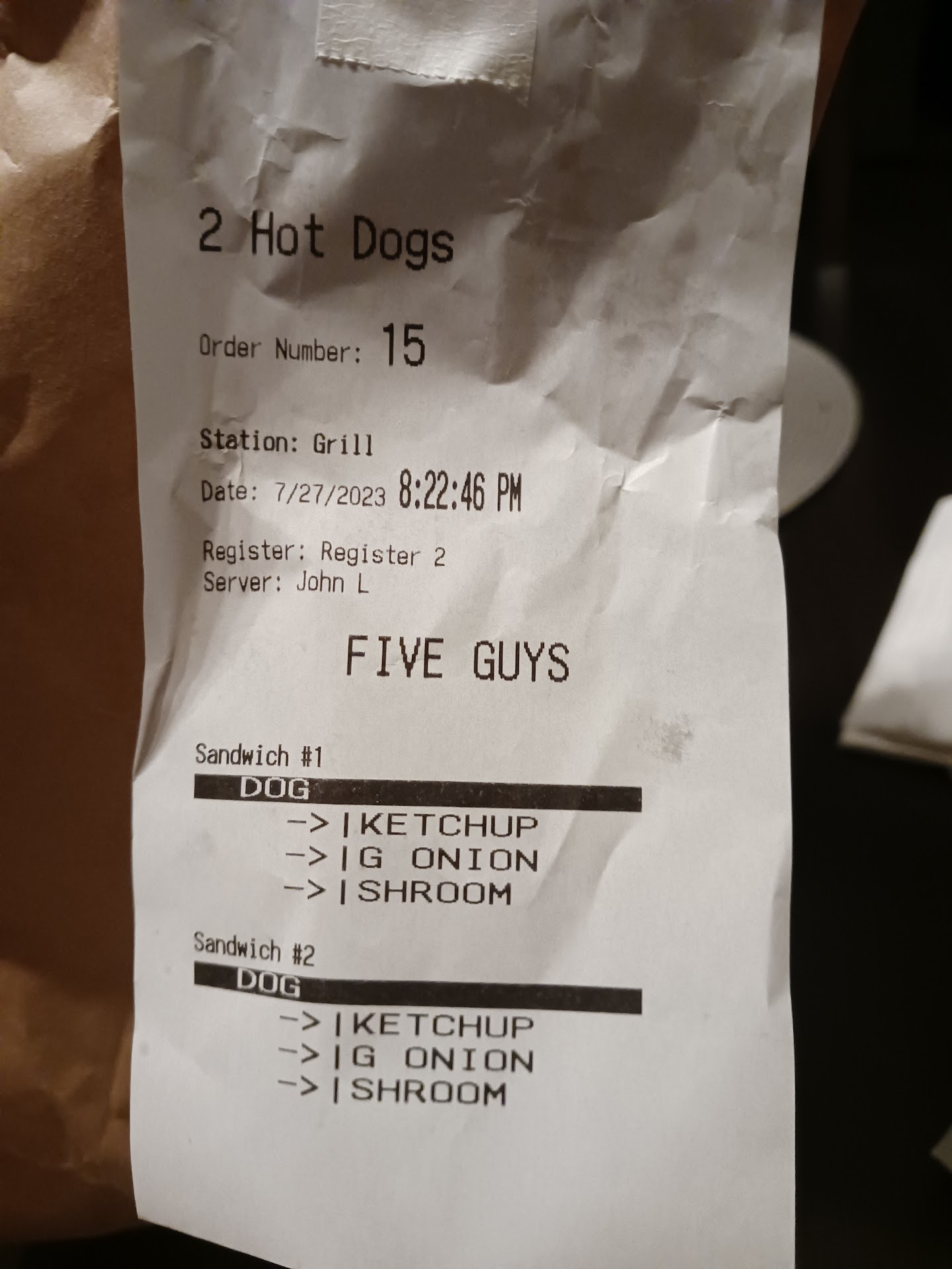 Our hot dogs only had ketchup and barely any onions. The mushrooms were missing. We waited for about 10 minutes while John and our order taker made our food. Then right before our order was up, another worker came out from the back and topped and wrapped our order.