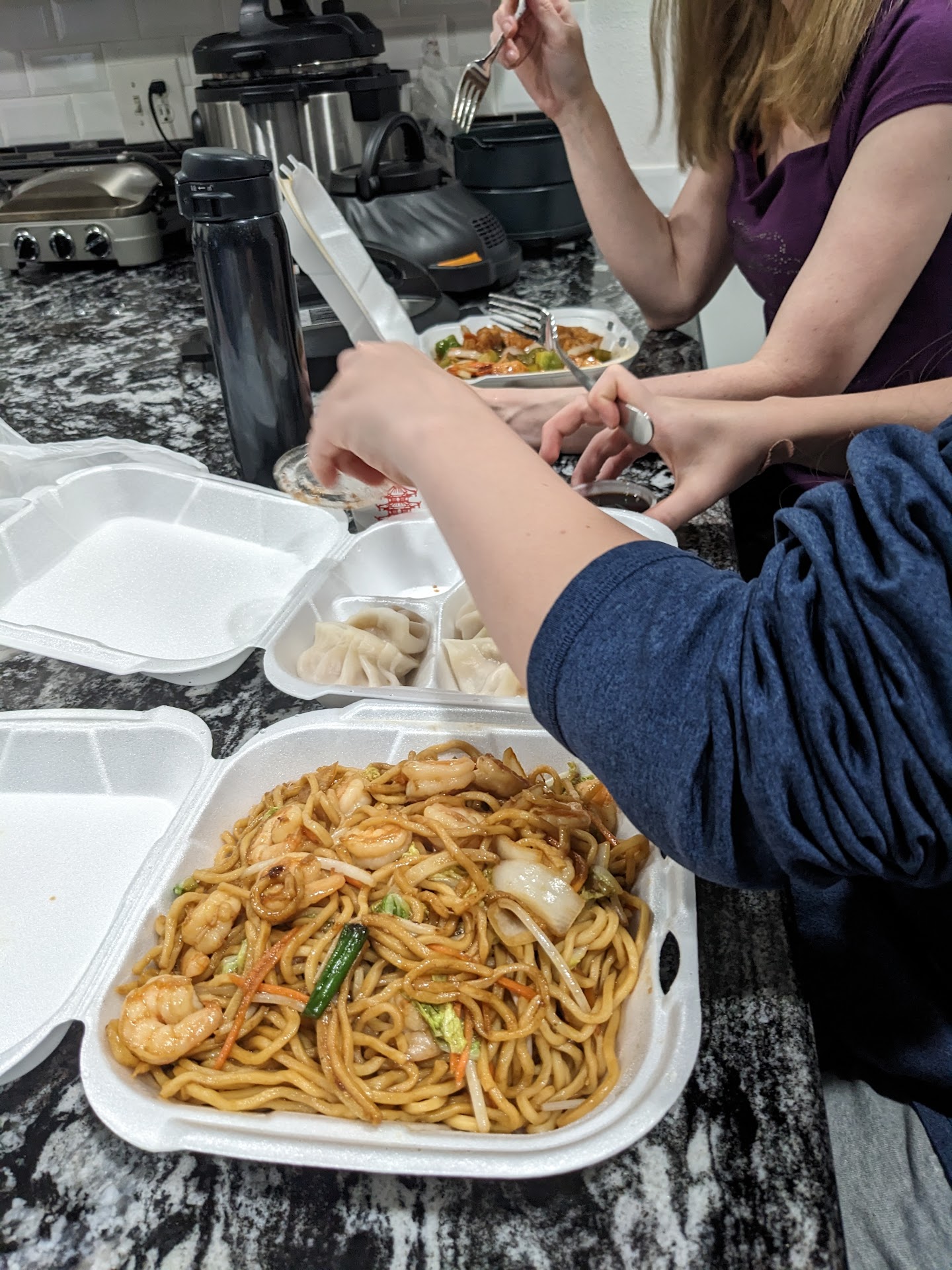 We ordered General Tso's chicken, shrimp lo mein, the house special bean curd, and one order of steamed dumplings. That came with white rice as well.