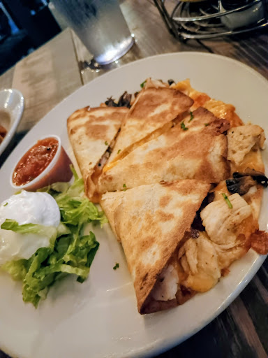 My daughter took me here and we chose to sit downstairs at the outdoor lounge to eat. They serve the full restaurant menu there. The restaurant is ground level, but above the lounge. Cute place, in or out. As a musician, i was pleased that a 3 piece band was just starting. They werent fancy, but did fairly well, good tunes, raw, but they entertained.