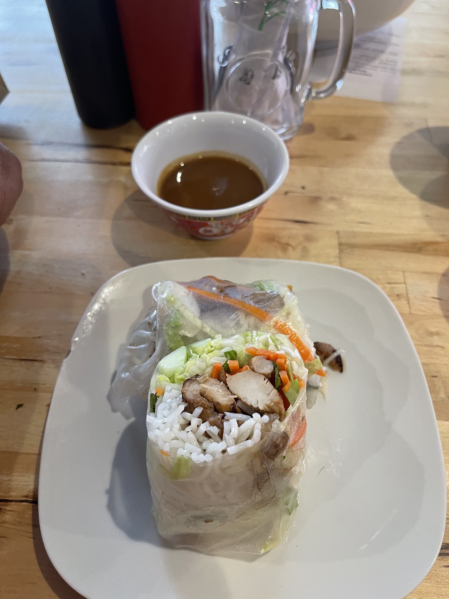 We started with the fresh roll, most Vietnamese restaurants have 2 per order, this had only one at a price more expensive than some we’ve been to. I had the beef pho and my husband had the chicken. My husband Jim sliced beef was slid into the hot broth uncooked and turned out delicious. The condiments were placed inside the bowl upon delivery to the table which was ok but I don’t like jalapeño peppers in mine to change the flavor of the broth, so they were quickly removed. my husbands chicken pho broth had good flavor, the chicken was in large chunks, dry and “old” tasting. Most was left behind in the bowl. Overall if we were downtown and in the mood for Pho would maybe...