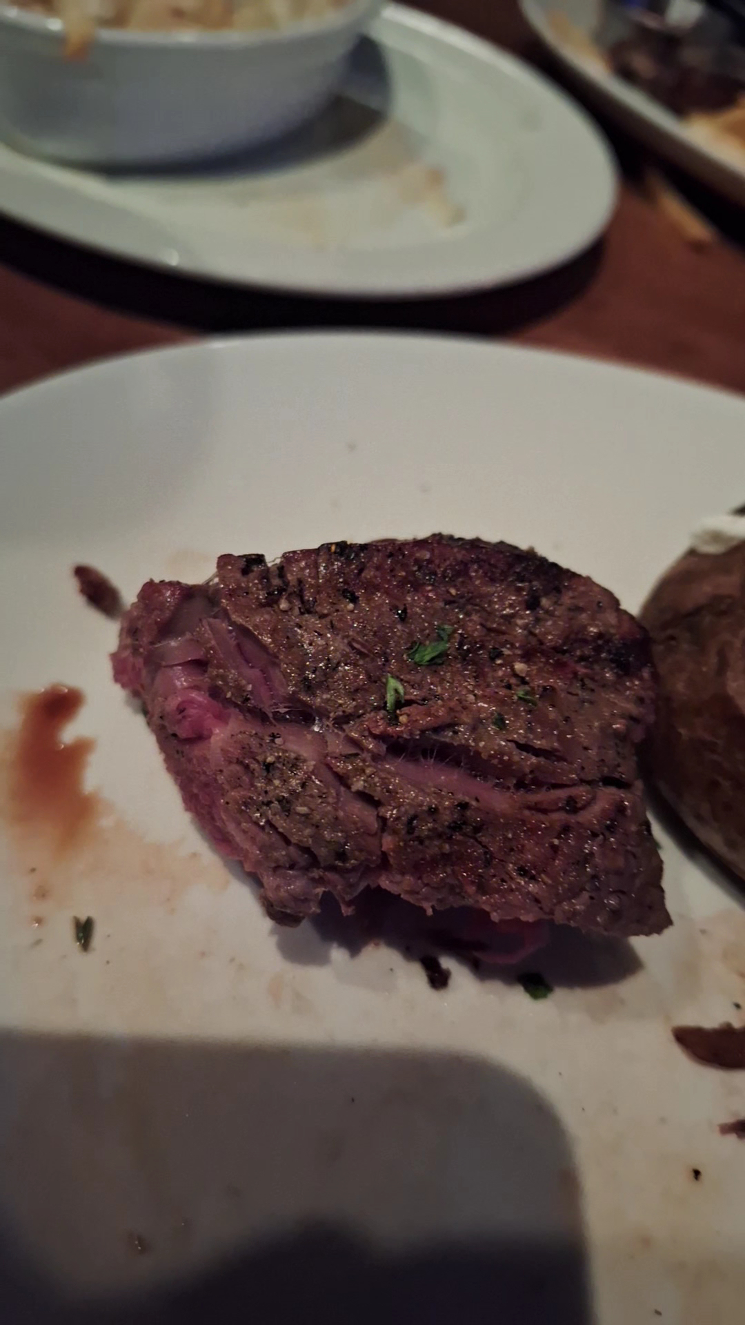 Finally after an hour our meals arrive. The steak, I asked for med rare. Not even close. Medium at best. Unfortunately as tough as shoe leather. Plus full of gristle. Basically inedible. Both steaks were the same.