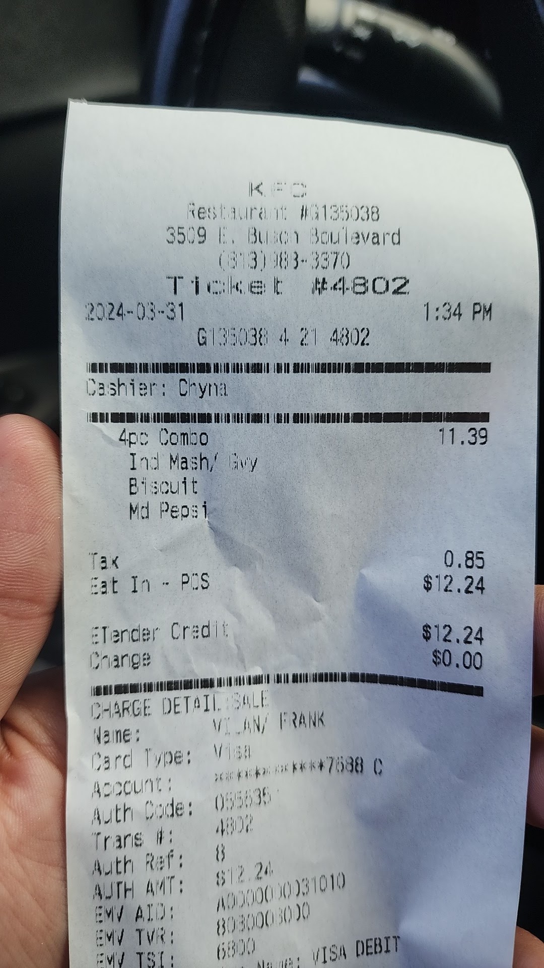 Read moreSo I just had the worst customer service at this KFC 2212 E. Fowler in Tampa. I ordered original chicken online and the app showed it was ready 5min before we got there. When I went in to pick up the manager asked for the name and walked back like he was going to get the order. Then he returns and says they don't have any original chicken and asked me angrily if I wanted crispy chicken. When I replied that I ordered original and the app says it's ready he proceeds to get increasingly belligerent telling me multiple times "Do you want to wait 16 minutes?! and Acting like I did something wrong. 2 other male employees were staring at me the whole time and started repeating about waiting 16 min??? I simply wanted the chicken I ordered but was treated like I wronged them somehow. Another female said she had same issue with attitude. And even the female worker there apologized for her manager s behavior acknowledging the lack of professionalism. My husband didn't get any attitude and I guess they didn't realize he was with me because we had 2 separate orders. Hello Sir, can I help you. ... Here's your order....thank you. To add color...I'm Black female and so was the other patron that received attitude. My husband is white. I hate to ask but please don't purchase from this KFC. The "Manager" name is Michael, and 2 other male employees that ganged up on me were not wearing name tags. Customer Service didn't seem too concerned about the issue and had no apology for that stores' bad behavior. And I had to ask them to do something like retraining or something. No one should be treated...