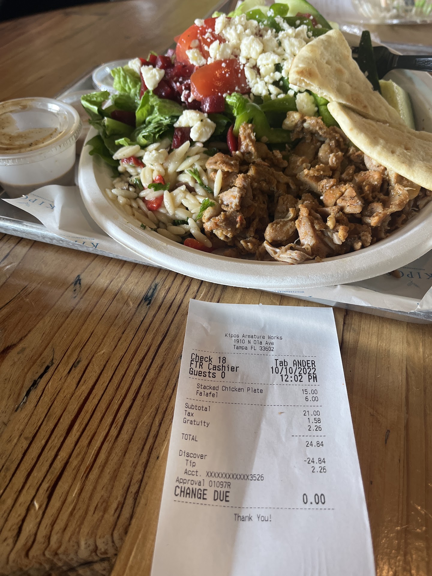 Ā Ā Ā Read moreMy review style is typically, if I donāt have anything nice to say, I donāt say anything at allā¦but after wasting $60, I figure itās worth letting potential diners know. I was drawn to Kipos for their Fries topped with tzatziki and fetaā¦if I had just gotten that, it would have been perfect! The fries were good and so were the toppings. The woman working said I could have the fries as a side to the chicken plate. Now, Iām not sure what kind of chicken this was but I expected chunks of chicken breast. This seemed like a chicken āproductā. Like maybe it was processed into sheets and then layered together. Iām not sure but it was disgusting. We ordered the Chicken plate with salad and it comes with cold orzo salad, not rice. A side of hummus and an extra side of pita. Two canned sodas. It was $58. I would not recommend anything but...