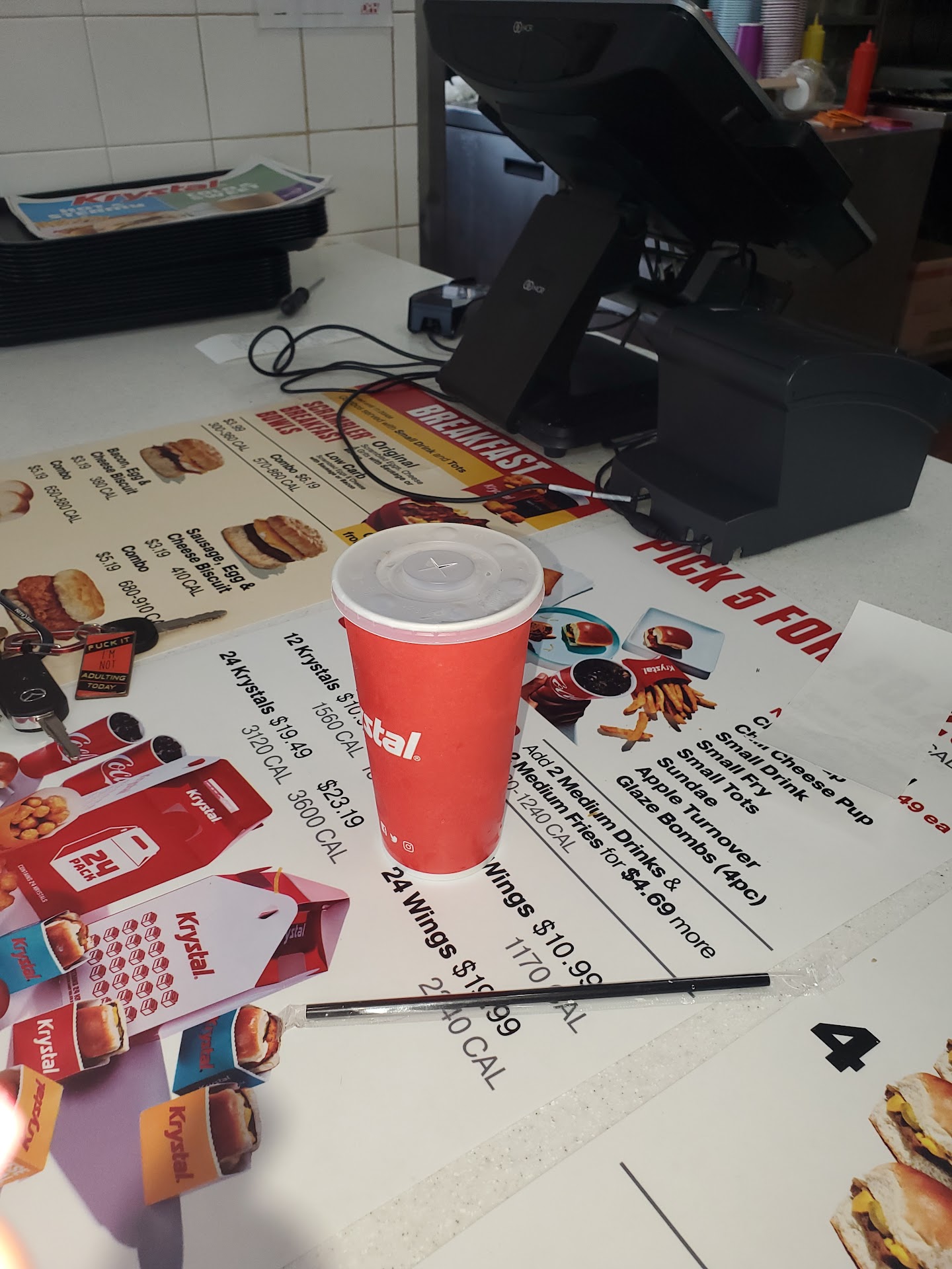 Read moreI visited with my sister and she opted for the drive thru. First there was no greeting just told to provide her order, she stated her order which was as follows: Krystal's pack with cheese, no pickles or onions, 2 small cokes and a large fry. When we arrived at the window the employee was rude, barely spoke in a manner that is appropriate for a customer service job. He mumbled and looked as if he rolled out of bed after sleeping in his uniform for several days. After paying he handed her one drink (which ended up being diet and felt as if left out for a little bit, with the ice melted and the cup dripping moisture). She inquired about the other drink and was told I only heard one now go park over there and it will be out. After waiting for some time the drive thru employee walked out and handed her the burgers,no fries. When asked about the fries there was a sigh and I was going to go back and get them. Next we checked the burgers which were full of pickles and mustard. When the drive thru guy came out she told him the order was not correct, in turn he said, well I didn't hear that, there's nothing I can do. My sister handed him the box of burgers and said I don't want these I would like the correct order. He fussed a little more, then said hold on. A young lady approached us and asked us what the issue was. My sister explained the issue and she said oh is that all and asked if she would please give her an opportunity to correct the order. She also asked if we wanted anything else, such as a refund or extra drink/fries? We said we appreciated the gesture but all we wanted was the correct burgers and that is all. I am not quite sure what her job title was or her name, but she should have been working with all customers then relocate that guy in the drive thru to food prep or out the door. I have family members who are under 10 who would have handled the entire situation...